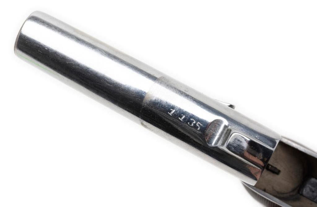 *Remington Arms Co. O/U derringer pistol, approximately .40 cal., serial #1435. The derringer is in overall good to nearly very good condition with 3” barrels. The pistol retains the majority of its thinning polished nickel finish. The checkered hard rubber grips are in overall good condition with small mars and compressions consistent with use. The bores are good, the action functions and the markings are sharp on this derringer. Est.: $150-$300.