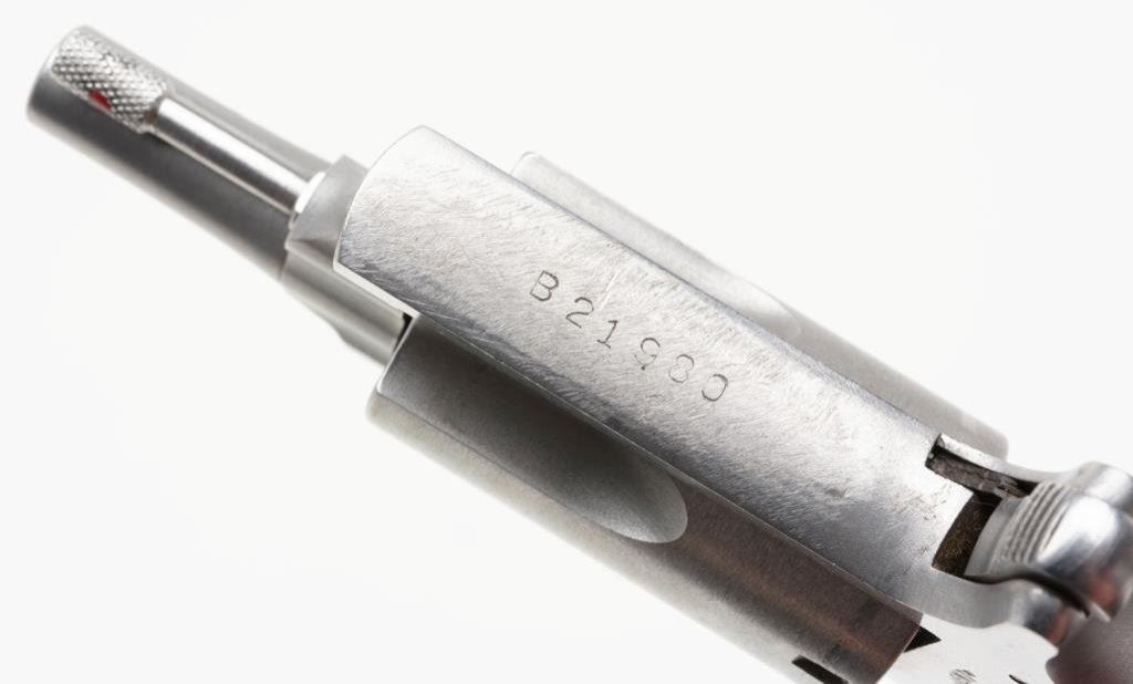 *Freedom Arms 4 shot revolver, .22 Magnum cal., serial #B21980. The revolver is in overall very good to nearly fine condition with a 1 ¼” barrel. The pistol retains nearly all of its stainless finish with only slight wear at the muzzle. The smooth black synthetic grips are in overall very good condition showing only minor handling marks. The bore is very good, the action crisp and markings are sharp on this diminutive pistol. Est.: $100-$200.