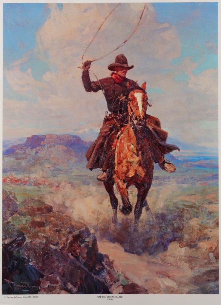 Color print entitled “On The Open Range” by noted Western artist Frank Tenney Johnson (1874-1939), approx. 26” x 19” on hardboard, from the Johnson Estate. Est.: $75-$100.