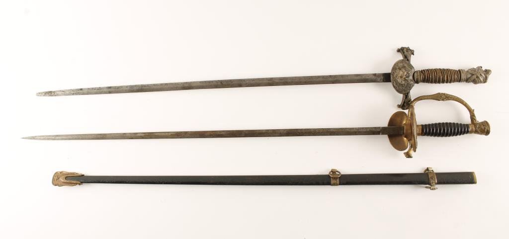 Lot 1989 Lot of 2 lodge swords; one with a metal scabbard and brass mounts; guard s