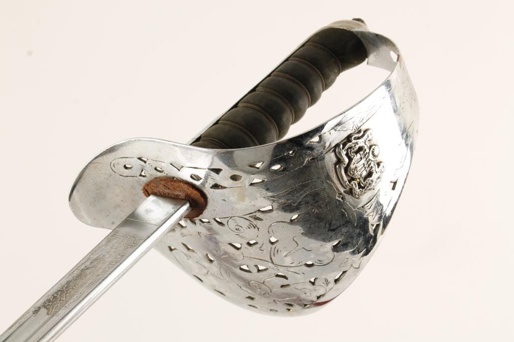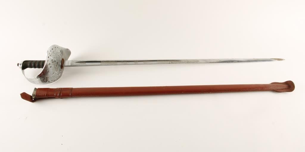 British sword with leather covered scabbard, etched blade, no visible maker’s marks; good overall condition. Est.: $150-$300.