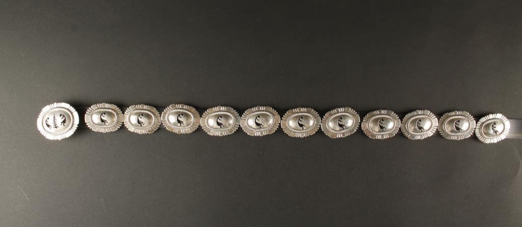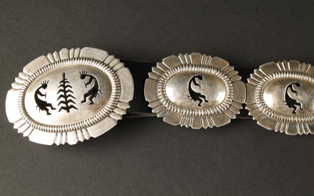Joe Paul 11 Conchos belt with matching Kokopelli designed buckle in very good condition. Est.: $150-$300.