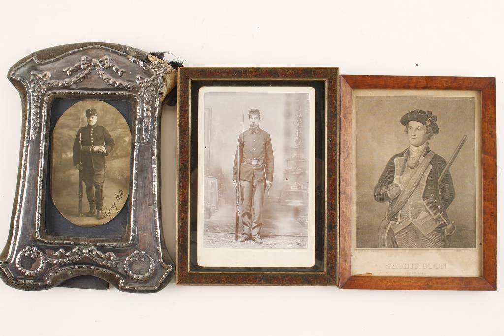 Lot of 2 photos: 1. photo of German Imperial era soldier signed Georg-1914 in silver frame with damaged end. 2. Cabinet photo of Indian War era soldier in uniform with kepi, trapdoor and early belt and buckle. Steel engraved print in bird eye maple frame of Washington in 1772. 7” x 4 ¾”. Marked painted by Dickinson, eng. by J.W. Steel. Est.: $100-$300