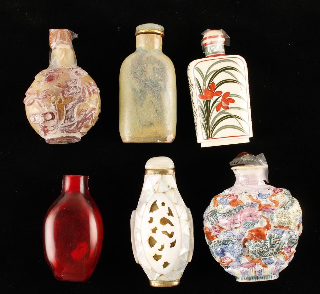 Lot of 6 various snuff bottles. Est.: $200-$400.