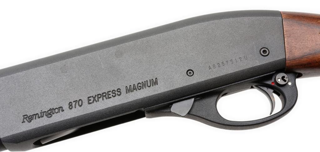 *Remington Model 870 Express Magnum pump action shotgun, 20 gauge, 28” ventilated rib barrel, S/N AB257512U, mat black finish, checkered wood stocks in overall excellent condition showing little if any use; red glow front sight. Est.: $300-$600.
