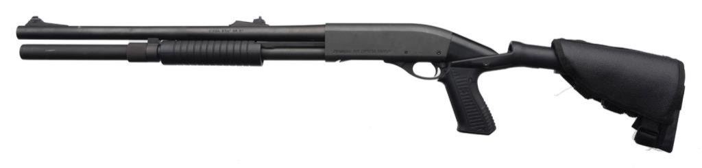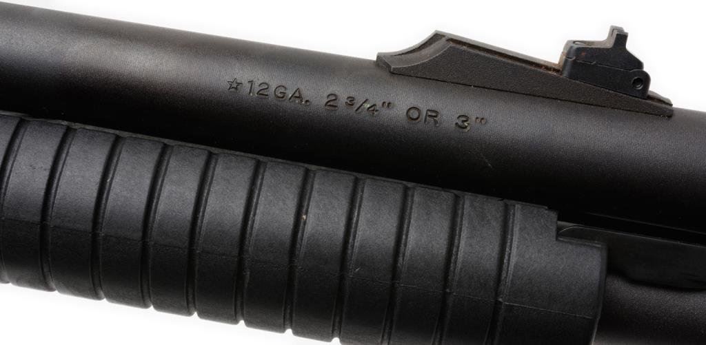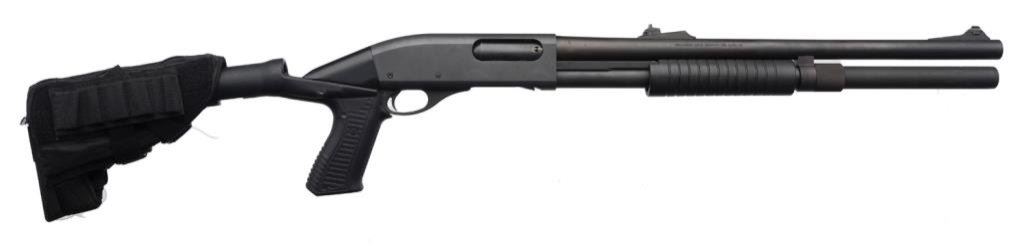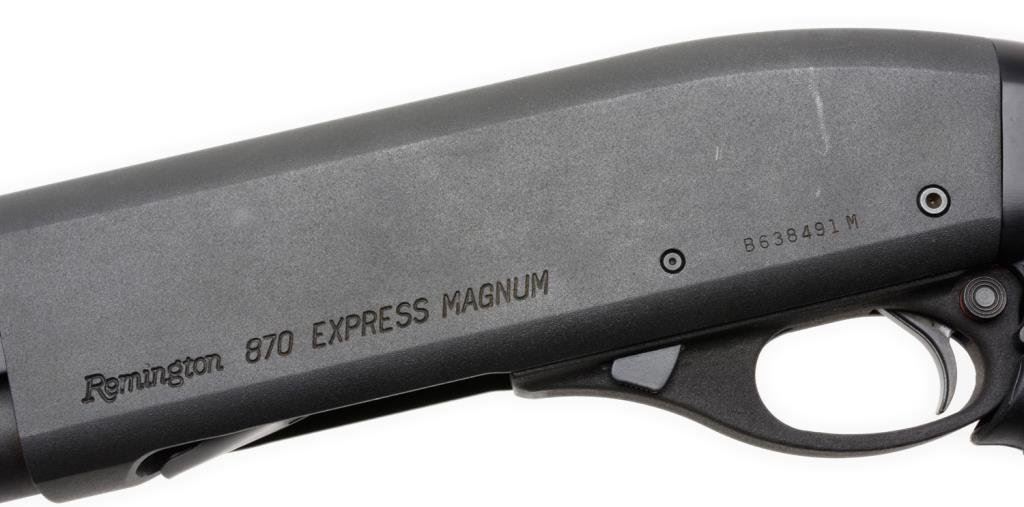 *Remington Model 870 Express Magnum pump action shotgun, 12 gauge, 20” barrel, S/N B638491M, mat black finish, composite stocks with shell holder attached to the butt stock; in overall fine condition showing little use. Est.: $300-$600.