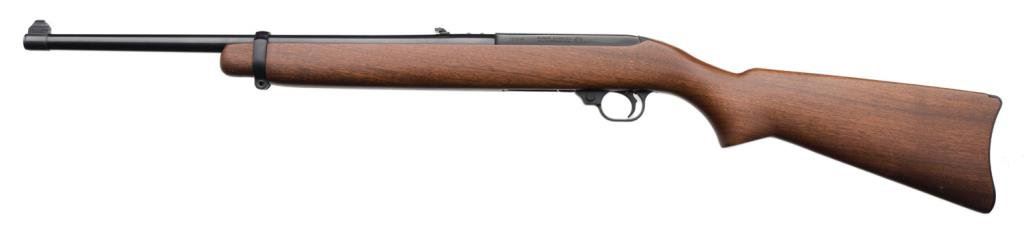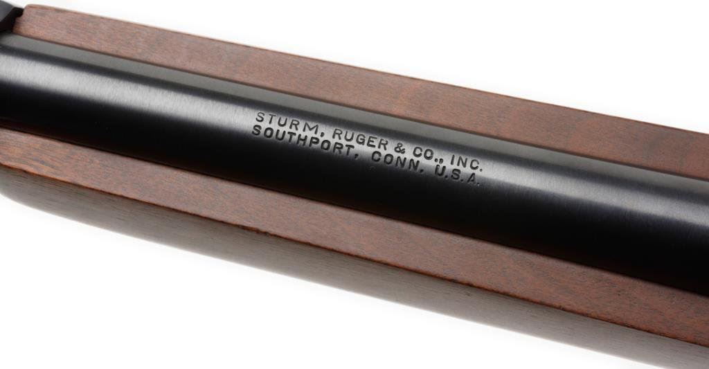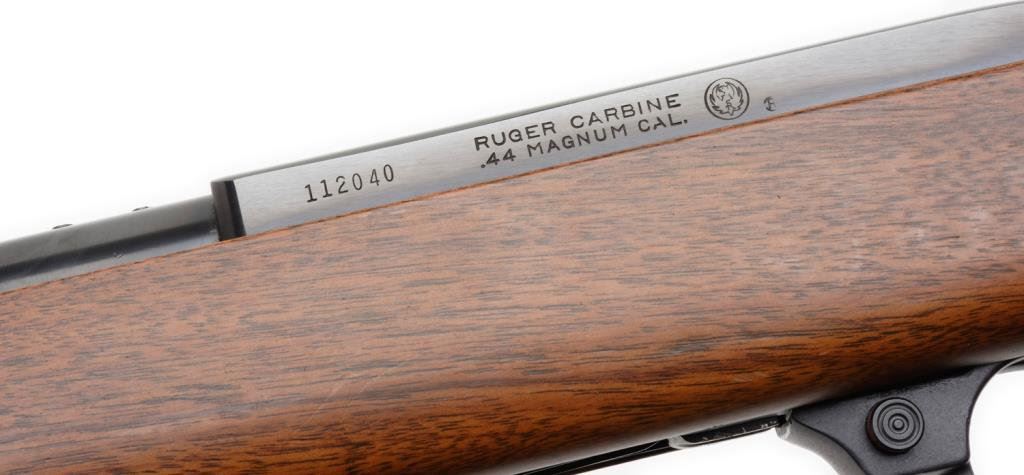 *Ruger semi-automatic carbine, .44 Magnum caliber, 18.5” round barrel, S/N 112040, black finish, wood stock in overall like new condition. Est.: $400-$800.