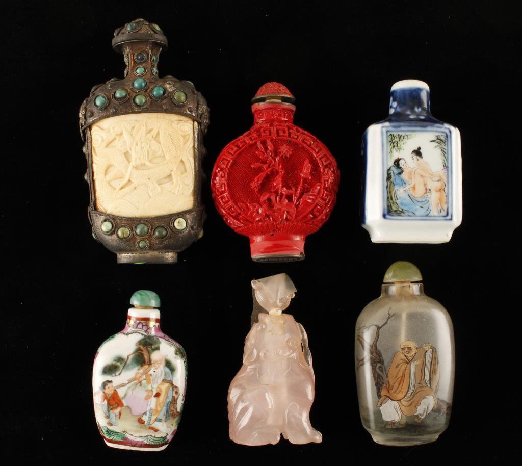 Lot of 6 snuff bottles; one rose quartz figural; one large size metal with stones and carved bone center; one erotic porcelain; one Peking glass inside painted of gods; one porcelain of boy with wise man and one cinnabar carved piece. Est.: $300-$600.