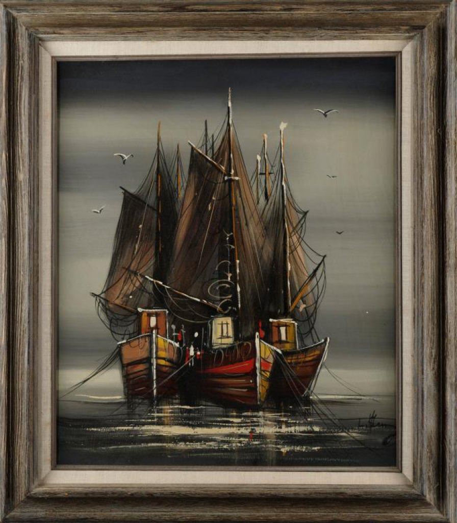 Framed original oil on canvas of ships at anchor, artist signature not clearly decipherable, approximately 31” x 27” overall; colorful and nicely done. Est.: $150-$300.
