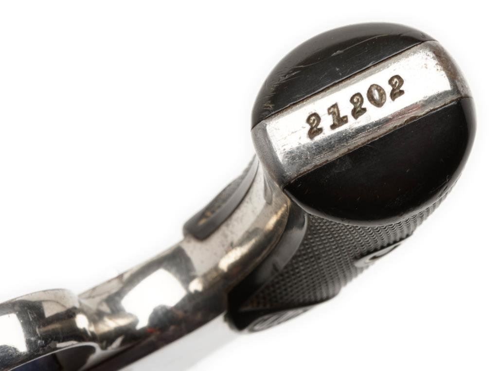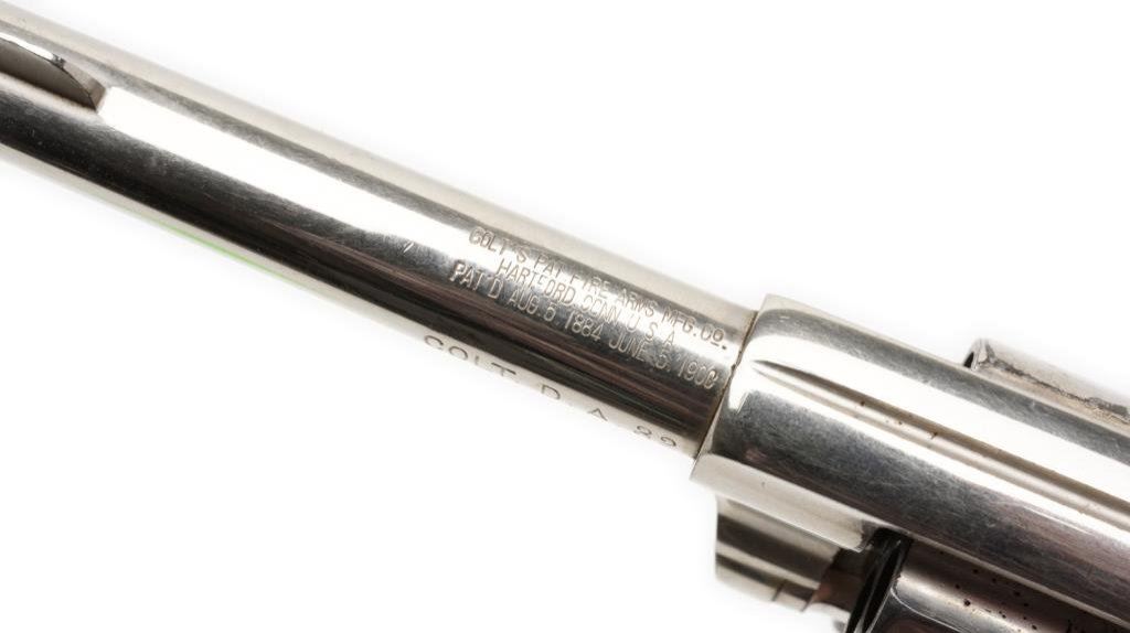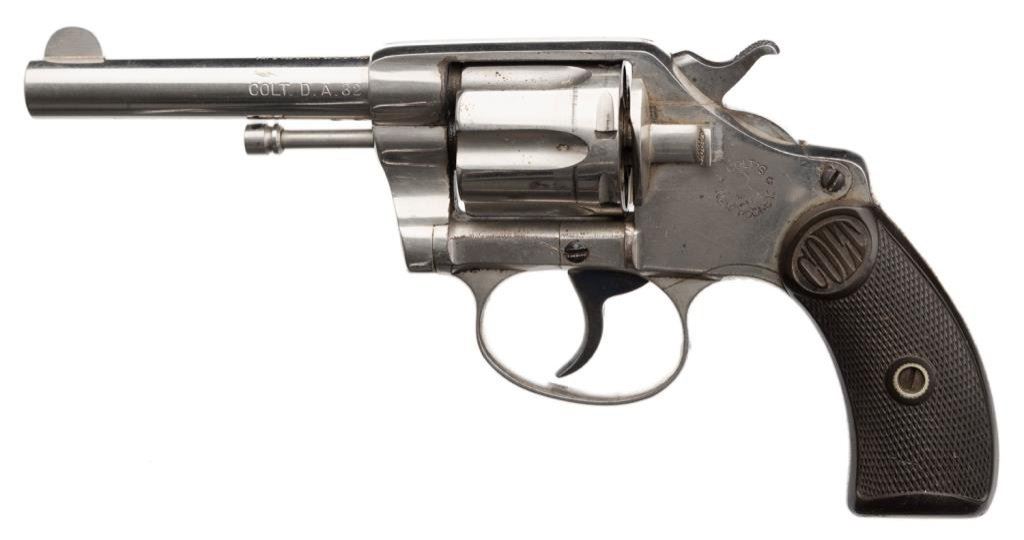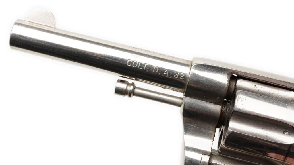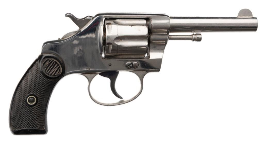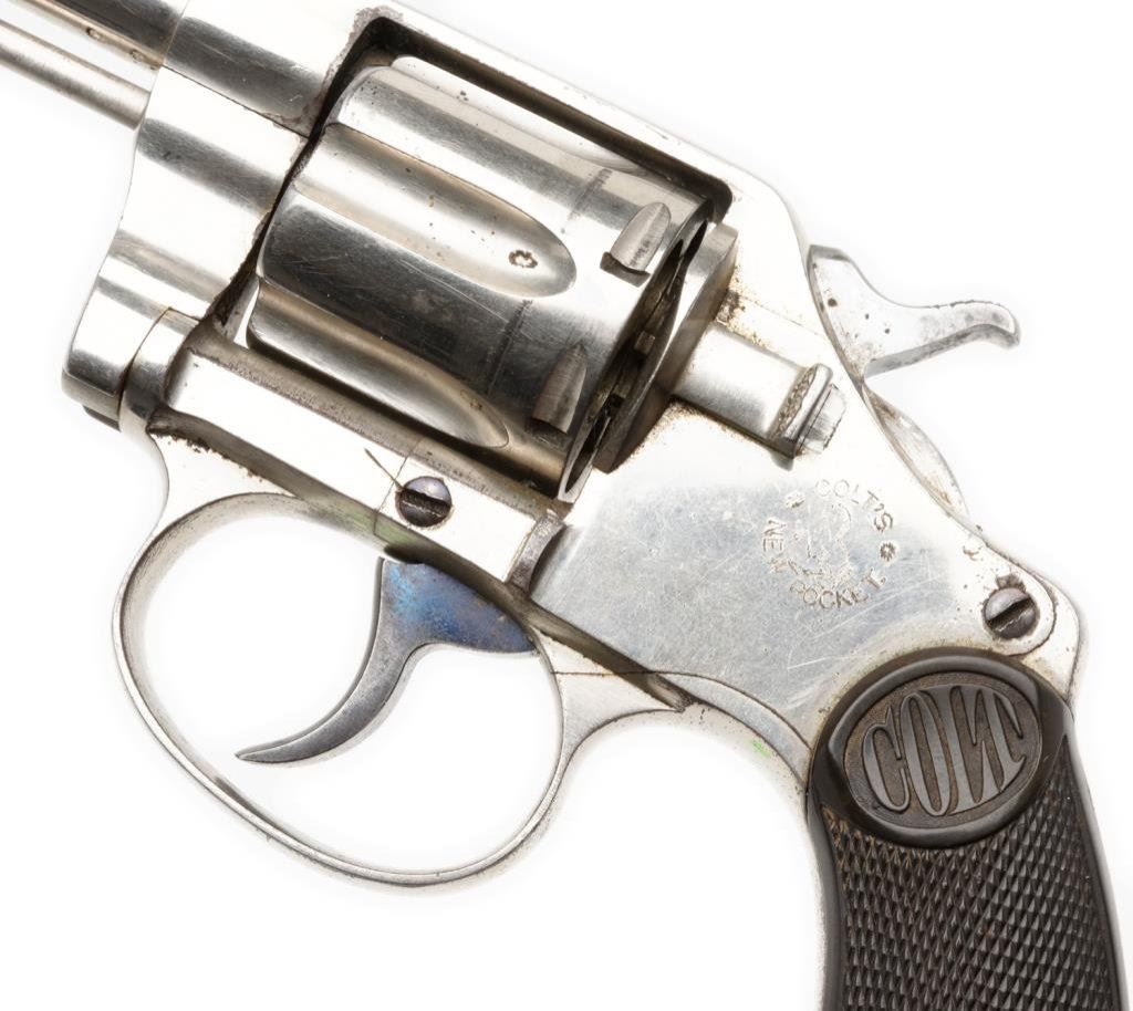 **Colt New Pocket DA revolver, .32 caliber, 3.5” barrel, S/N 21202, nickel finish, checkered hard rubber grips in overall very good + condition. Est.: $300--$600.