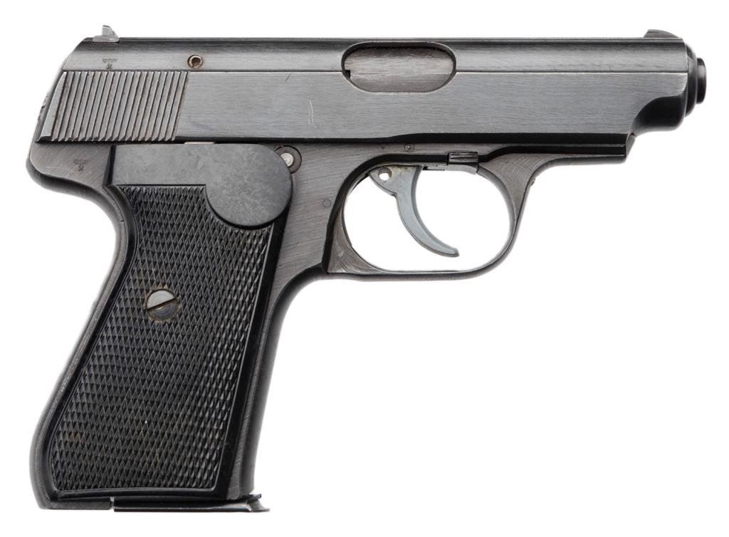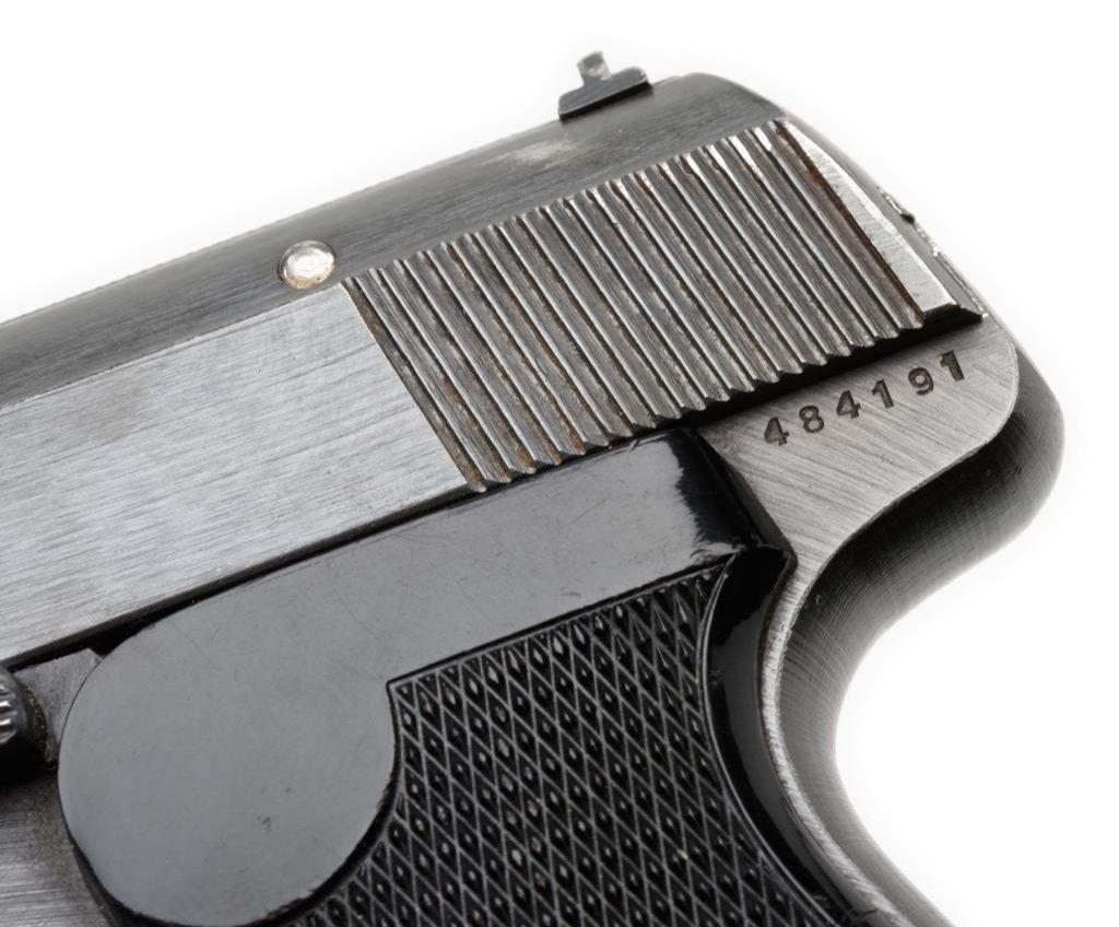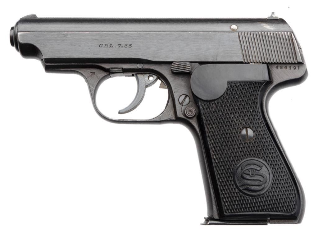 **Sauer DA semi-automatic pistol, 7.65mm caliber, Waffen “3” proofed, 3.5” barrel, S/N 484191, blued finish, checkered black plastic grips in overall fine condition showing the majority of its original finish, very good bore, crisp action and fine grips. Est.: $400-$800.