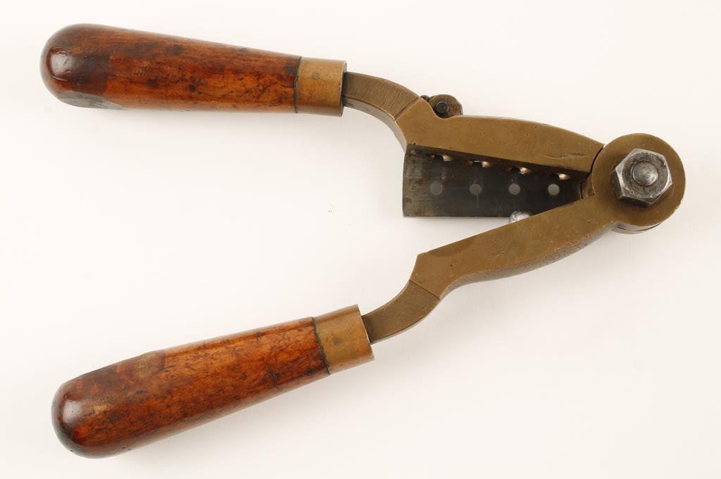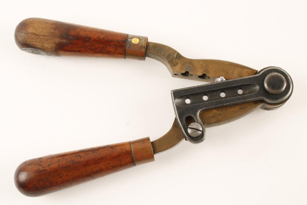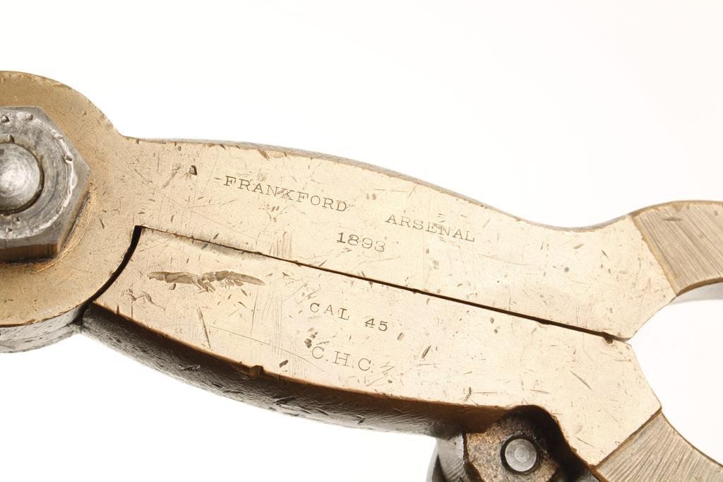 Large Springfield Gang Mold. Four-position large Springfield brass and iron gang mold for gallery practice round lead balls. Wood handles. Back sides of brass "legs" stamped "FRANKFORD ARSENAL 1893" on one "leg" and "CAL 45, C. H. C." on the other "leg." Condition: This martially inspected mold is in overall good to very good condition with a pleasing patina and wood grips that show wear on the left grip's end and some scattered old mars and scratches from use and storage.EST.: $350- 700