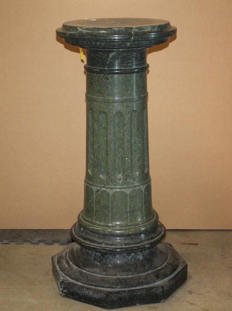 Green stone pedestal for display of artwork in 19th Century style made in the 20th Century; approximately 36” in height with round top 13.25 across radius; very heavy; compare at $4,000 retail; minor wear. Est.: $600-$1,200.