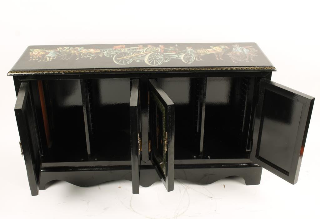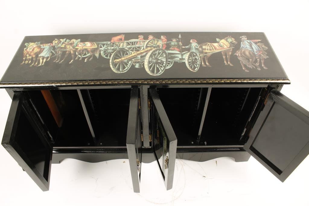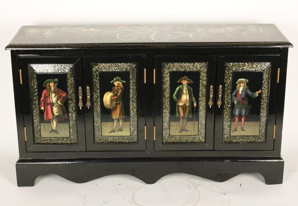 Lacquered and painted wood small cabinet with inside for C.D.’s; Napoleonic scenes, contemporary but quality from designer; approximately 15.5” in height by 28”. Est.: $150-$300.