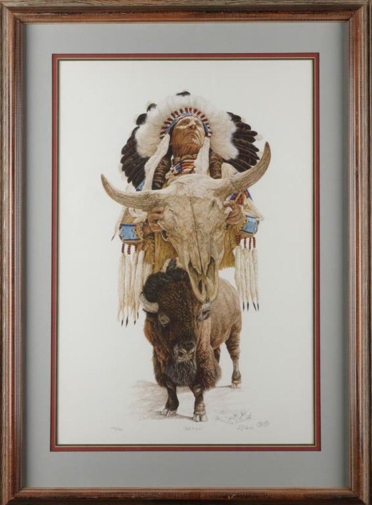 Large framed triple matted color limited edition (449/950) hand signed print of Indian Chief, buffalo and skull entitled “Part Gloves”, approximately 37” x 27” overall; signature difficult to decipher but expertly accomplished. Est.: $200-$400.