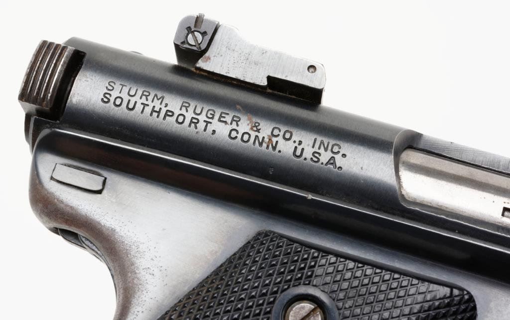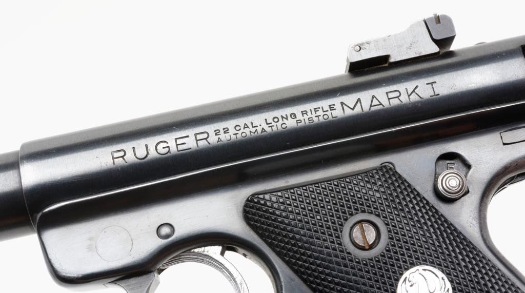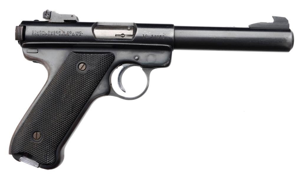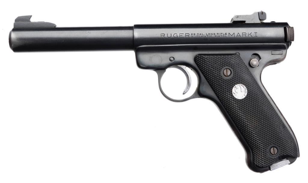 *Ruger Mark I semi-automatic target pistol, .22LR, 5.5” barrel, S/N 10-37982, blued finish, black checkered medallion grips in overall very good to fine condition with some high point and muzzle wear. Est.: $250-$450.