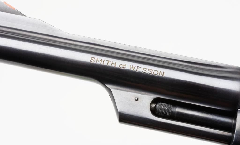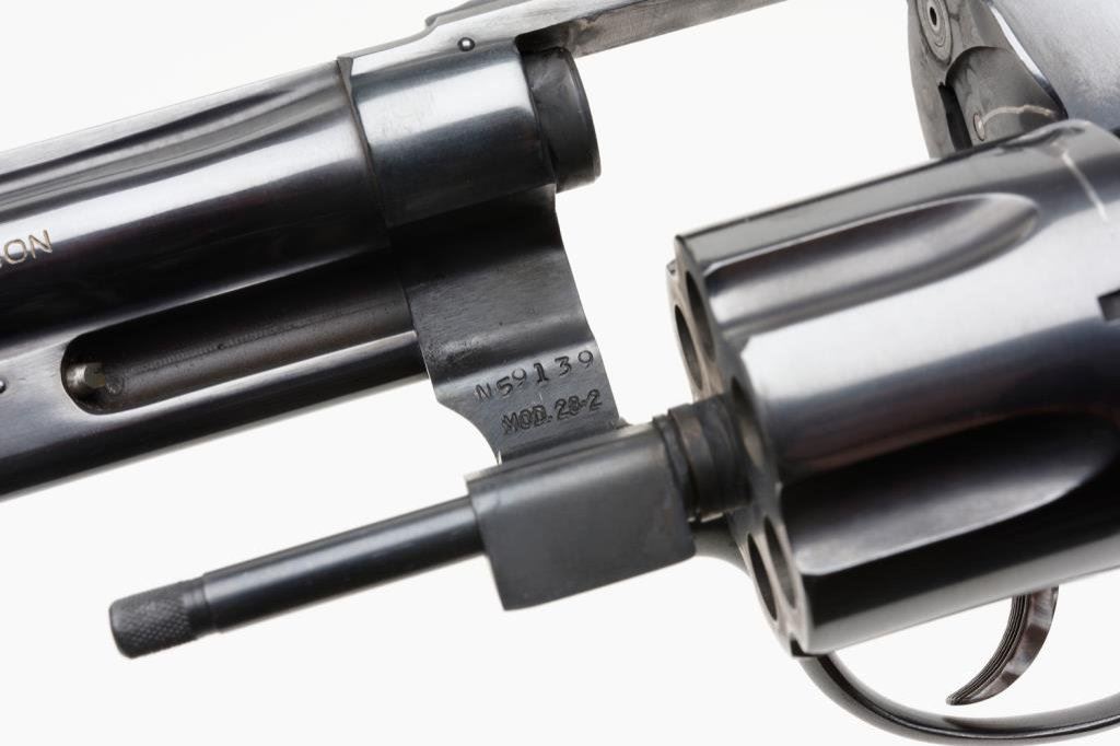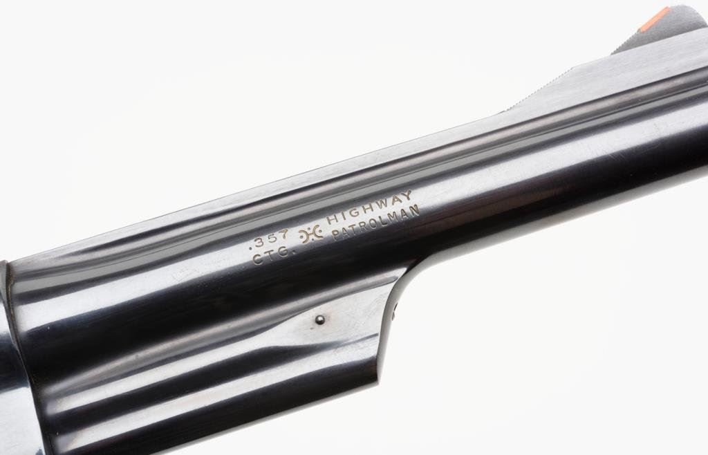 *Smith & Wesson Model 28-2 Highway Patrolman DA revolver, .357 Magnum caliber, 6” barrel, S/N N59139, blued finish, checkered wood medallion combat grips in overall fine condition; polished hammer and trigger. Est.: $700-$1,400.