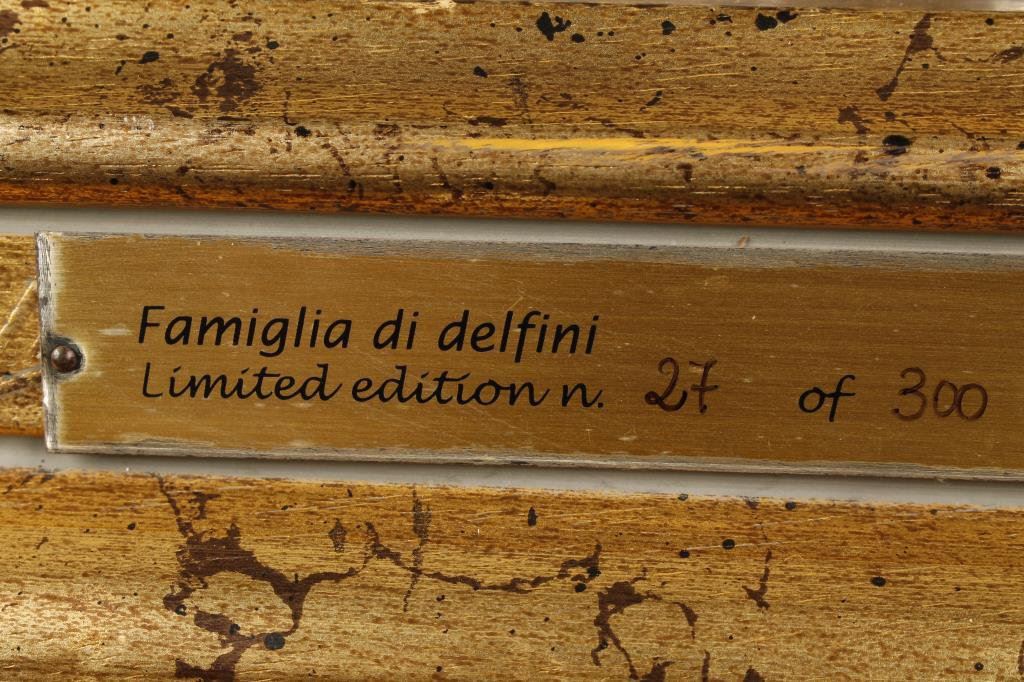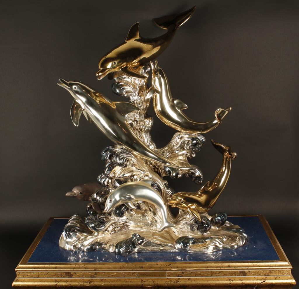 Modern artwork of dolphins at sea in plated metals titled “Famigliadi delfini” (21 of 300 edition); Italian artist signed; approximately 26.5” in height not including base, 27” wide, 3” base; excellent condition. Est.: $600-$1,200.