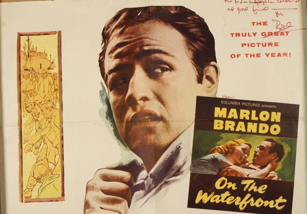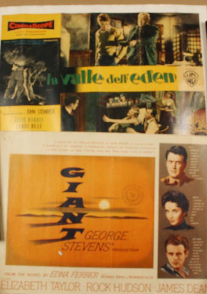 Lot of 3 half sheet movie posters sold as one lot including: “On the Waterfront”, starring Marlon Brando. The poster is signed, “For Irv-Collector and Good Friend”. Bud Schulberg-screen writer. Irv was an employee of the Hollywood Reporter. “Giant”, produced by George Stevens in 1956, starring James Dean, Elizabeth Taylor and Rock Hudson. “East of Eden”, preserved on linen, starring James Dean. The poster features Italian titles intended for foreign release. Est.: $300-$600.