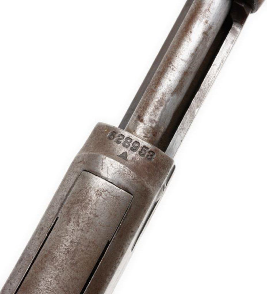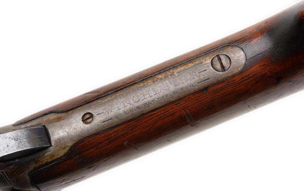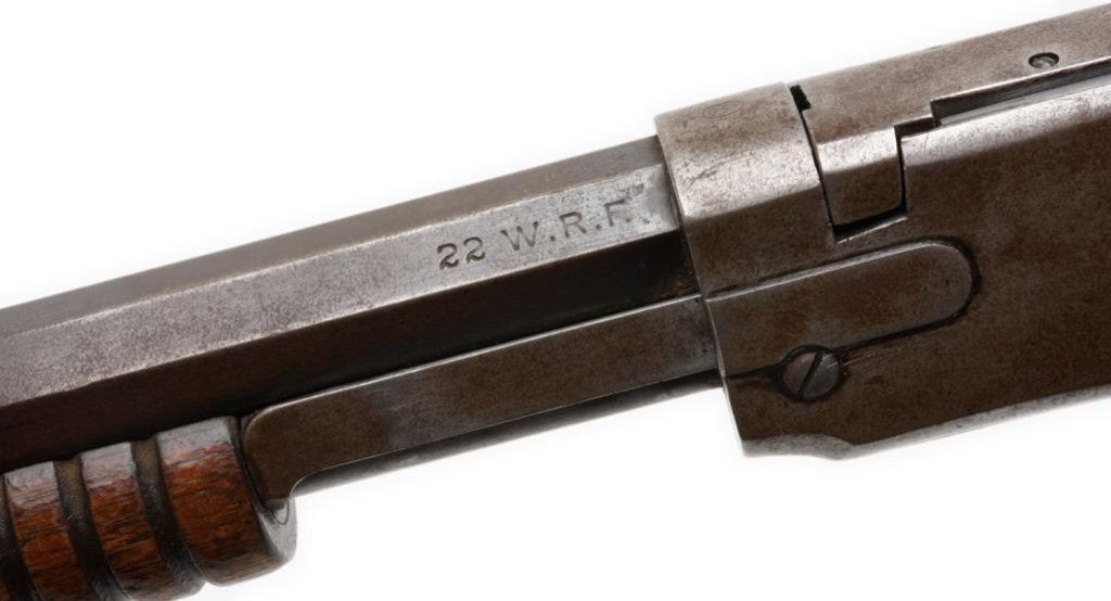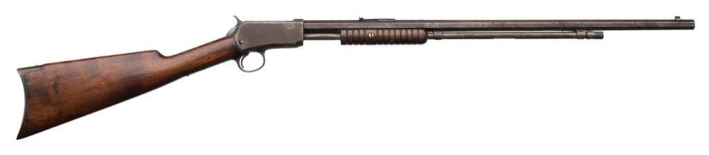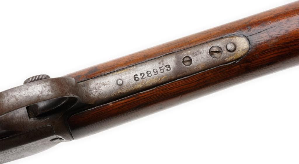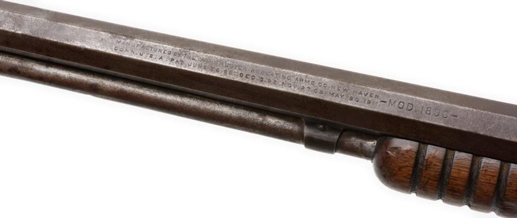 **Winchester Model 1890 pump action rifle, .22 W.R.F. caliber, S/N 628953, in fair to good condition with traces of blue; brass screw added in forend. Est.: $350-$700.