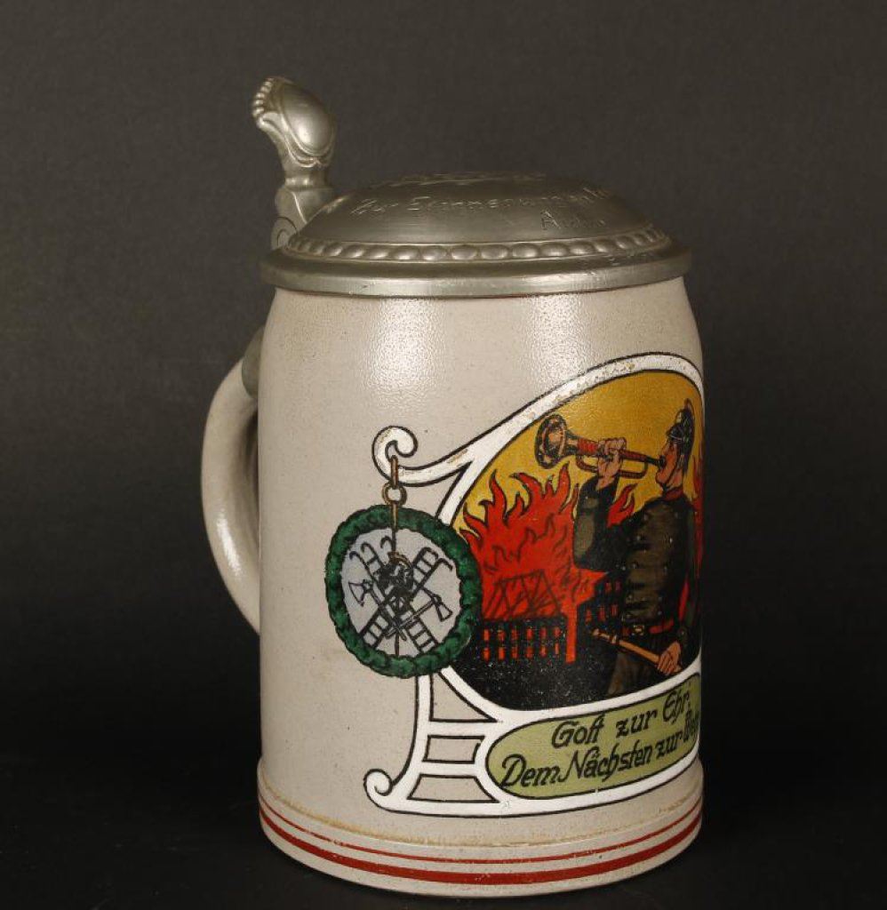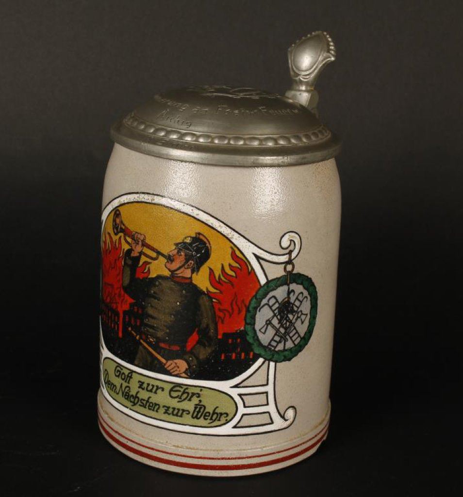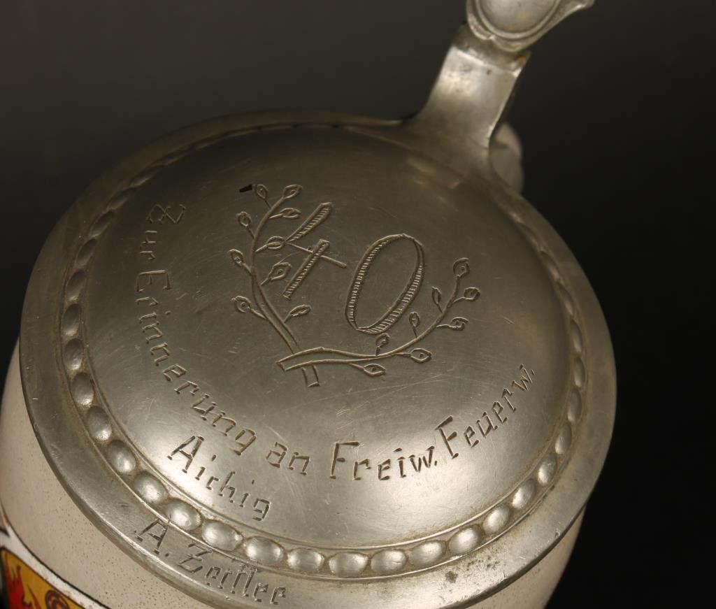 Lot 2105 German Occuipational stein; “Fireman”; 40 year inscription on lid. Est.