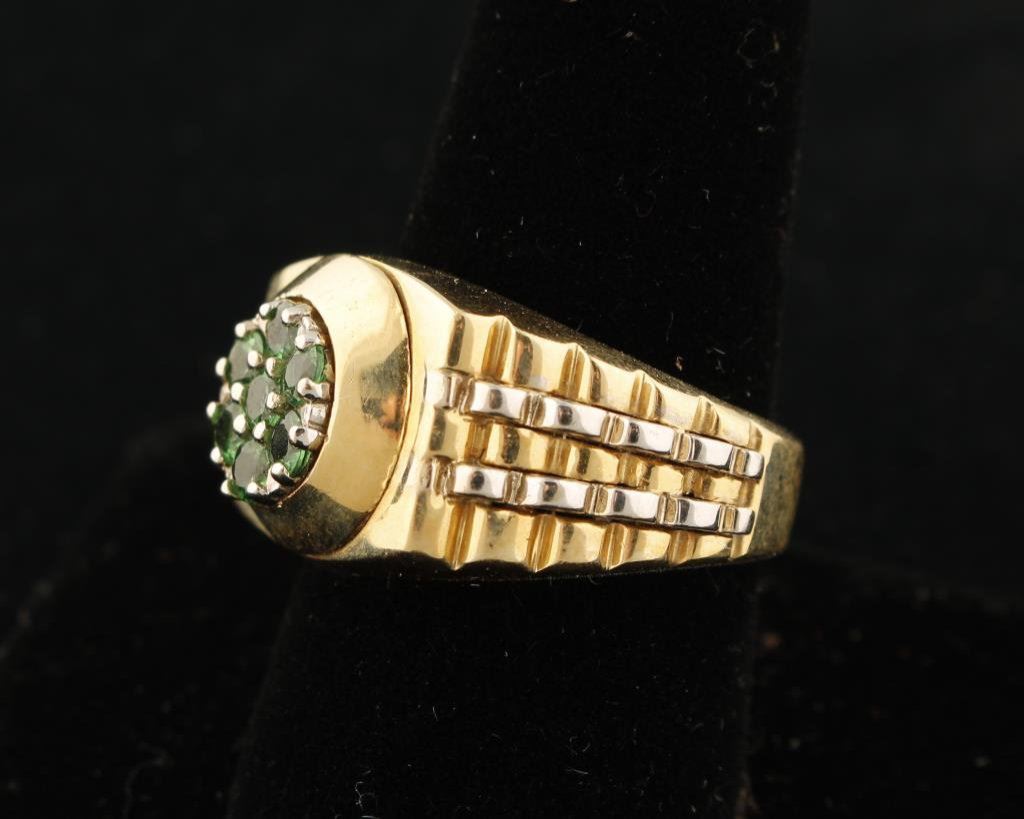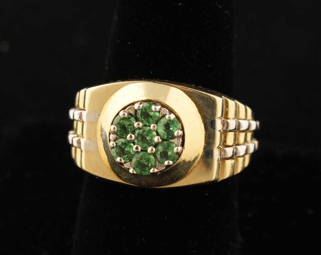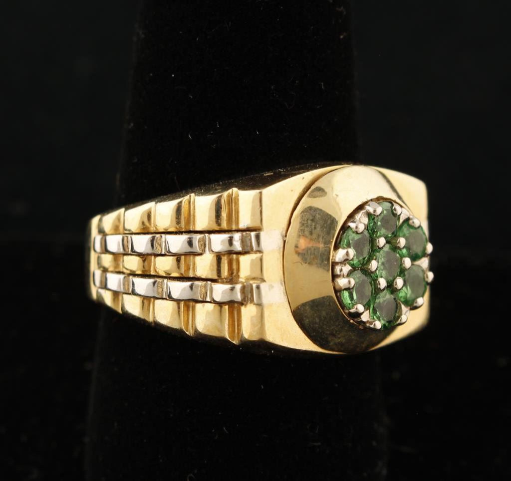 14K Gold man’s Rolex style ring mounted with bright green garnets from the area of Mount Kilimanjaro, Africa. Est.: $900-$1800