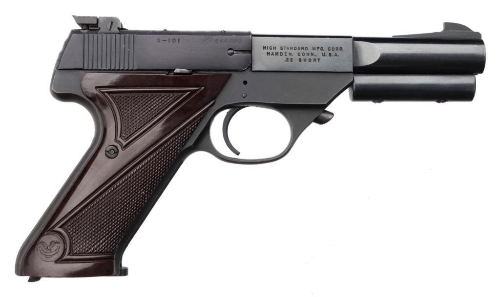 *Hi-Standard “Olympic” Model semi-automatic pistol, .22 short caliber, 4.5” barrel with target weight, S/N 644390, blued finish, maroon checkered plastic grips; overall excellent condition and desirable. Est.: $400-$800.