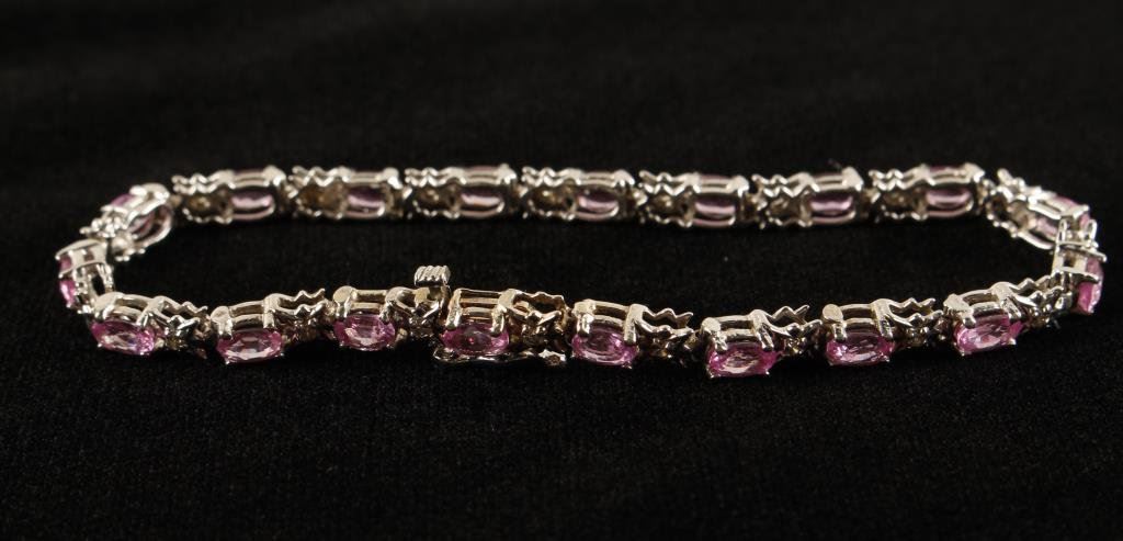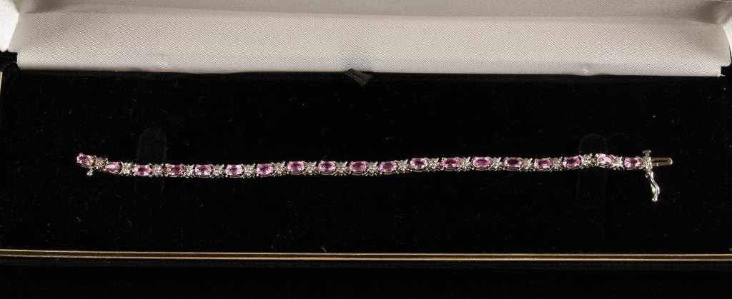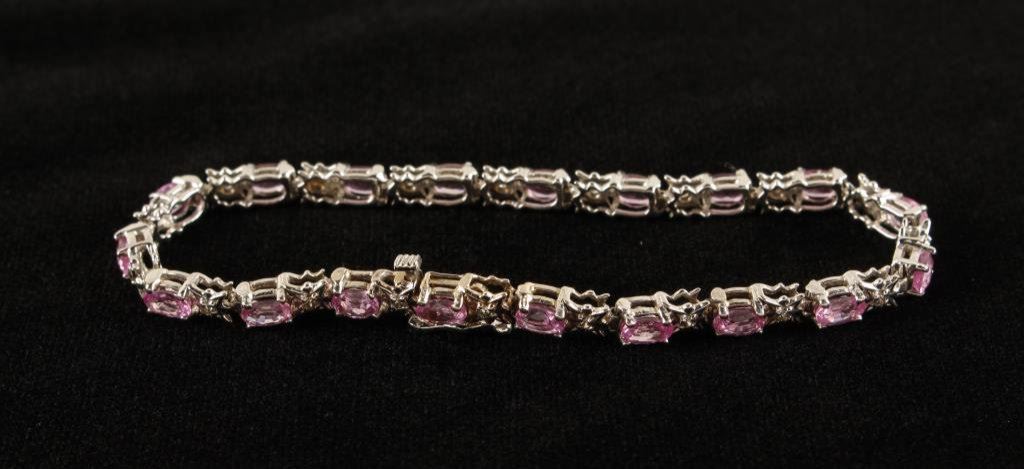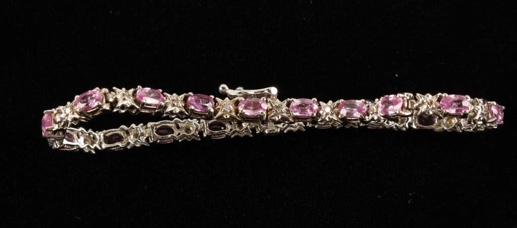 One beautifully designed pink sapphire and diamond bracelet. 19 pink sapphire weighing approx 6 Ct . Est:$1,000-1,500