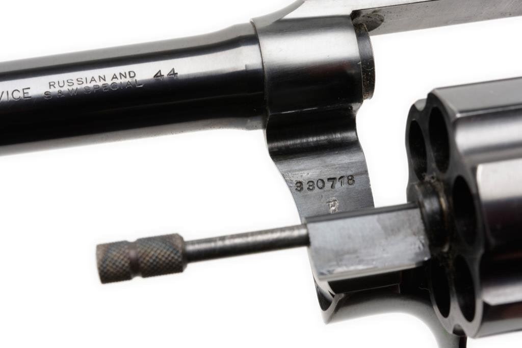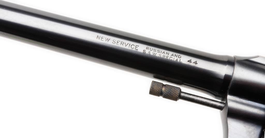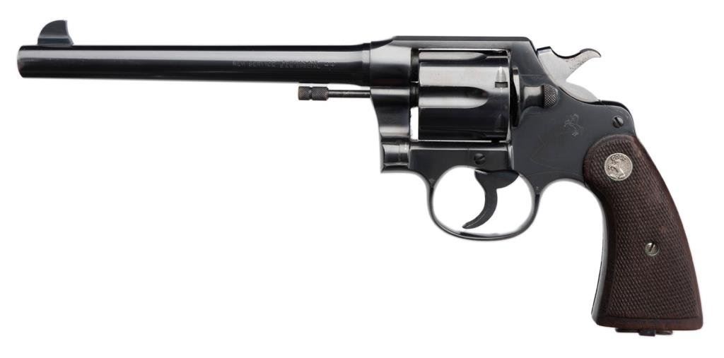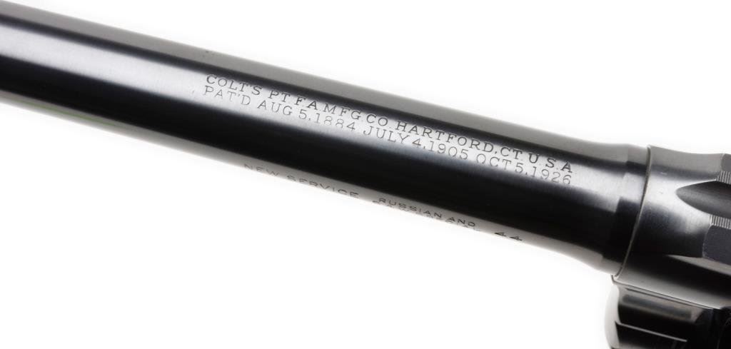 **Colt New Service DA revolver, .44 Russian and S&W Special caliber, 7.5” barrel, S/N 330718, blued finish, checkered wood medallion grips, lanyard ring; overall fine to excellent condition; accompanied by a Colt factory letter indicating .44 S&W caliber, 7.5” barrel, blue finish, grips “Not Listed”; shipped to W. Bingham & Co., Cleveland, OH on April 25, 1930; one gun in shipment. Est.: $1,000-$2,000.