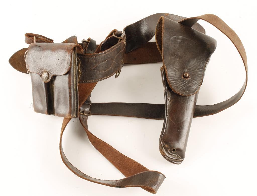 Early U.S. Officers “Sam Browne” rig for a .45 auto with Eagle snap clip pouch. No makers or dates, WWI to 1930s. Good with some wear and use. Est.: $200-$400
