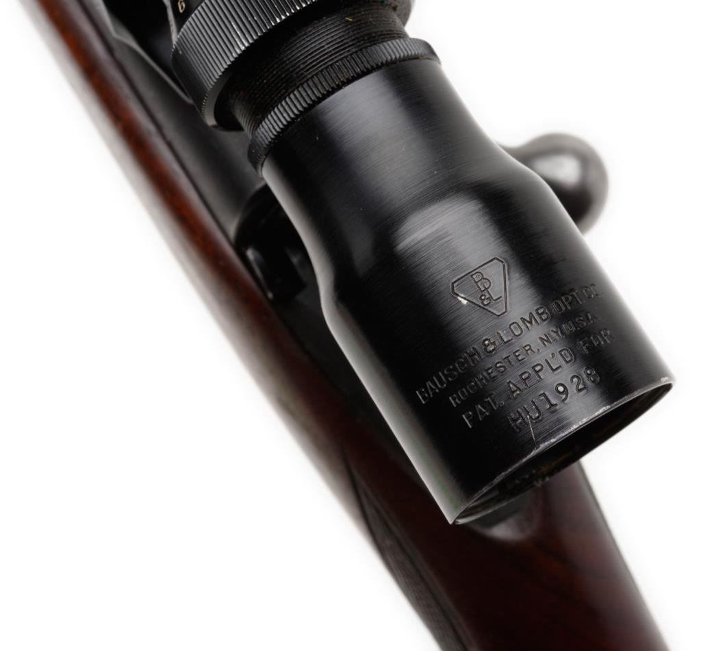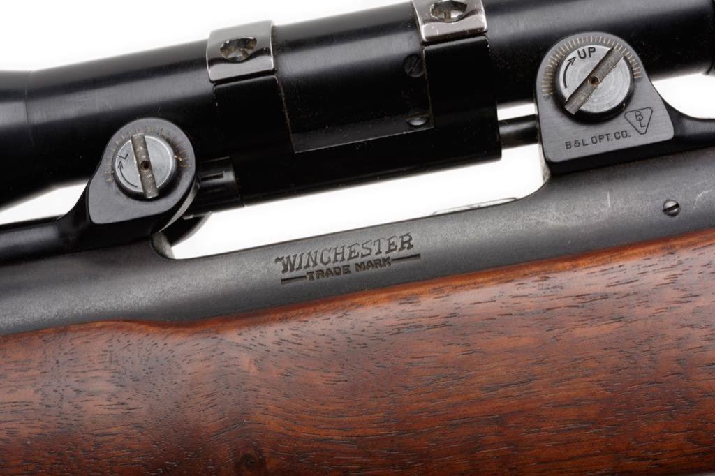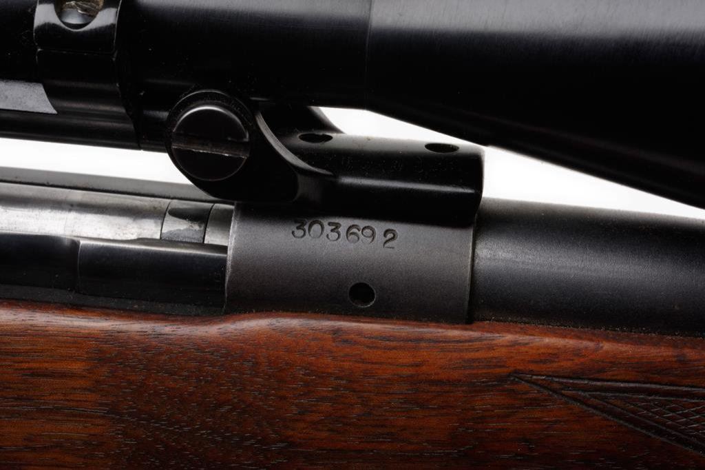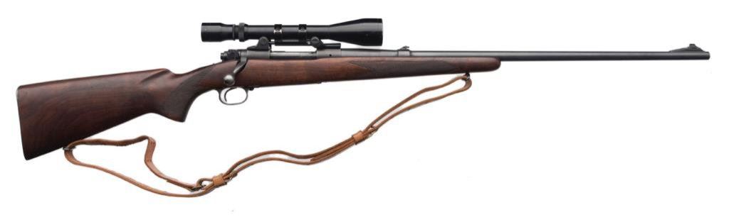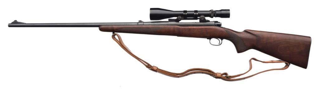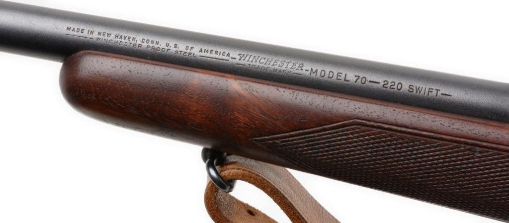 * Winchester Model 70 bolt action rifle, .220 Swift cal., serial #303692. The rifle is in overall very good condition with a 26” blued barrel. The barrel and receiver retain the majority of their thinning blued finish with moderate wear on the magazine plate and trigger guard. The rifle features a ramp front and folding rear sights. The checkered wood stock is in overall very good condition showing small mars and compressions consistent with field use. The rifle ends with a checkered steel butt plate showing significant blue finish and includes a period leather sling. The rifle is topped with Bausch and Lomb adjustable proprietary mounts and a Balvar 8 variable power 2.5 x 8 scope. The bore is very good, the action is crisp and markings sharp. A desirable Model 70 in a hard to find caliber. Est.: $700-$1,400.
