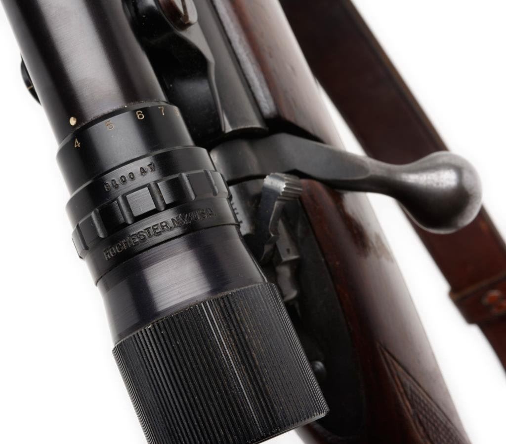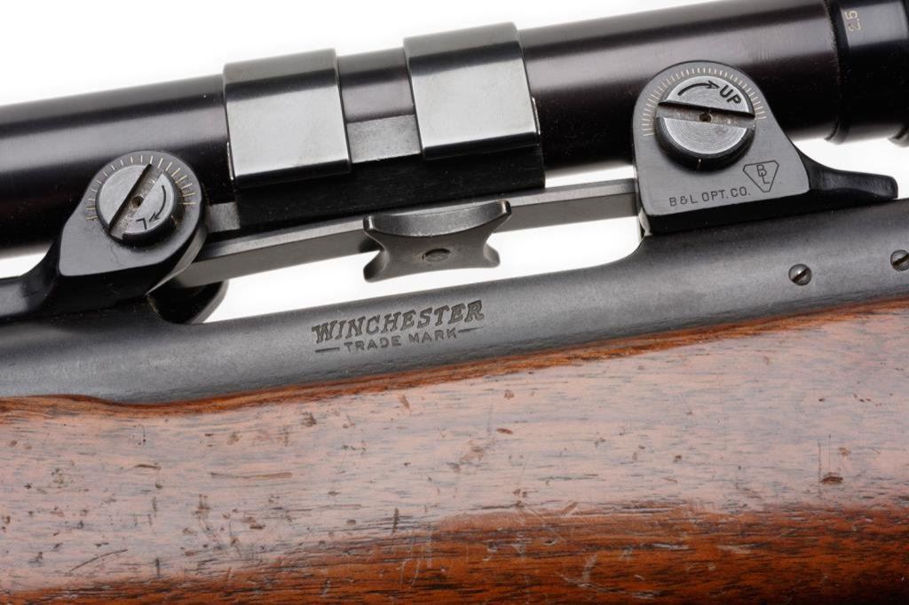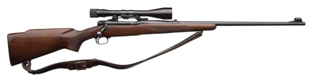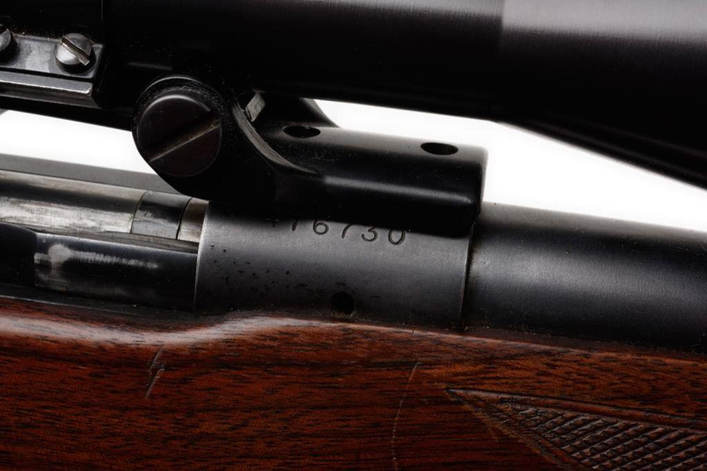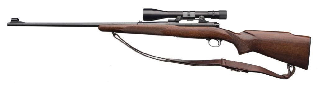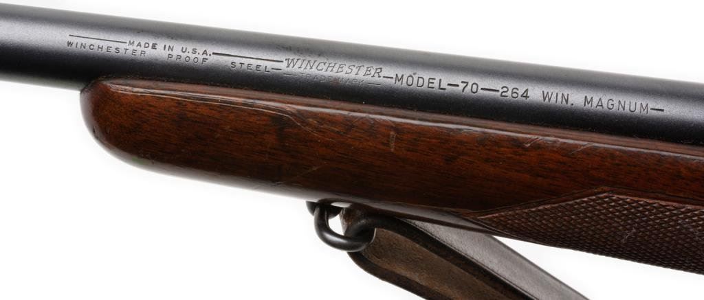 * Winchester Model 70 bolt action rifle, .264 Winchester Magnum cal., serial #476730. The rifle is in overall very good condition with a 26” blued barrel. The barrel and receiver retain nearly all of their blued finish with only slight handling marks evident. The rifle features a hooded ramp front and folding rear sights. The checkered wood stock is in overall very good condition showing only small mars consistent with storage. The rifle ends with a checkered steel butt plate showing significant blue finish and includes a period leather sling. The rifle is topped with Bausch and Lomb adjustable proprietary mounts and a Balvar 8 variable power 2.5 x 8 scope. The bore is very good, the action is crisp and markings sharp. A desirable Model 70 in a great caliber. Est.: $750-$1,500.