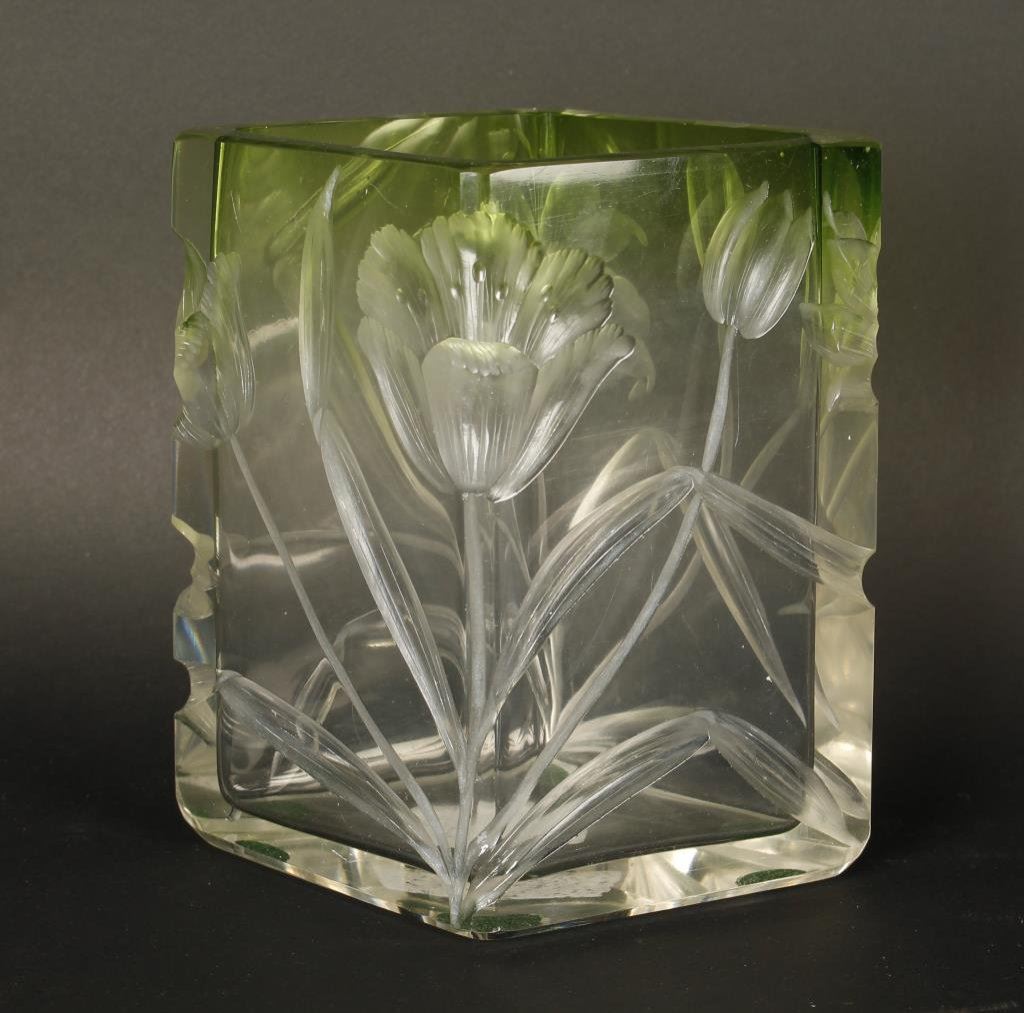 Lot 2140 Moser glass vase circa 1900 in clear green showing intaglio cut iris patte