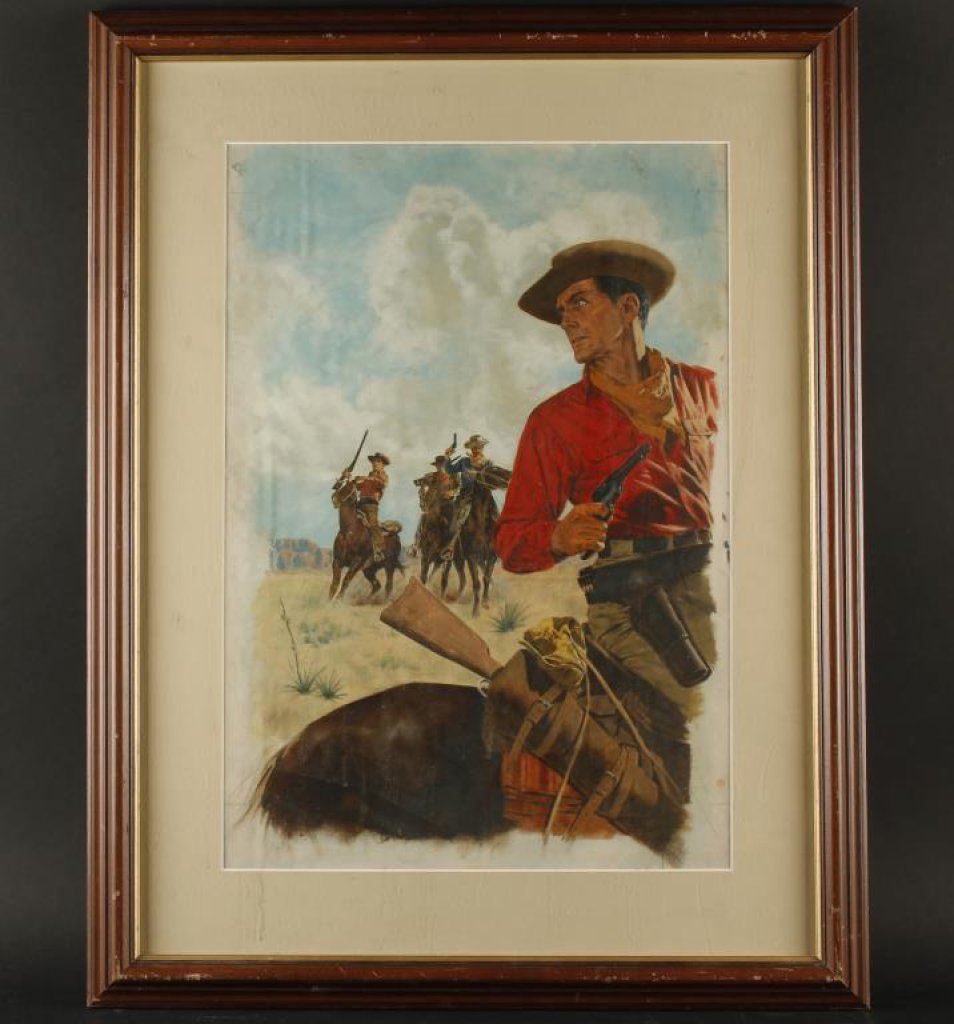 Watercolor on paper unsigned measuring approximately 20 1/2” x 14 1/2”. Shows Western cowboy with Colt single action drawn and a Winchester carbine in his scabbard while being pursued by three armed men with Western landscape in background. Probably 1950s to 70s, for a book illustration. Est.: $500- $1,000.