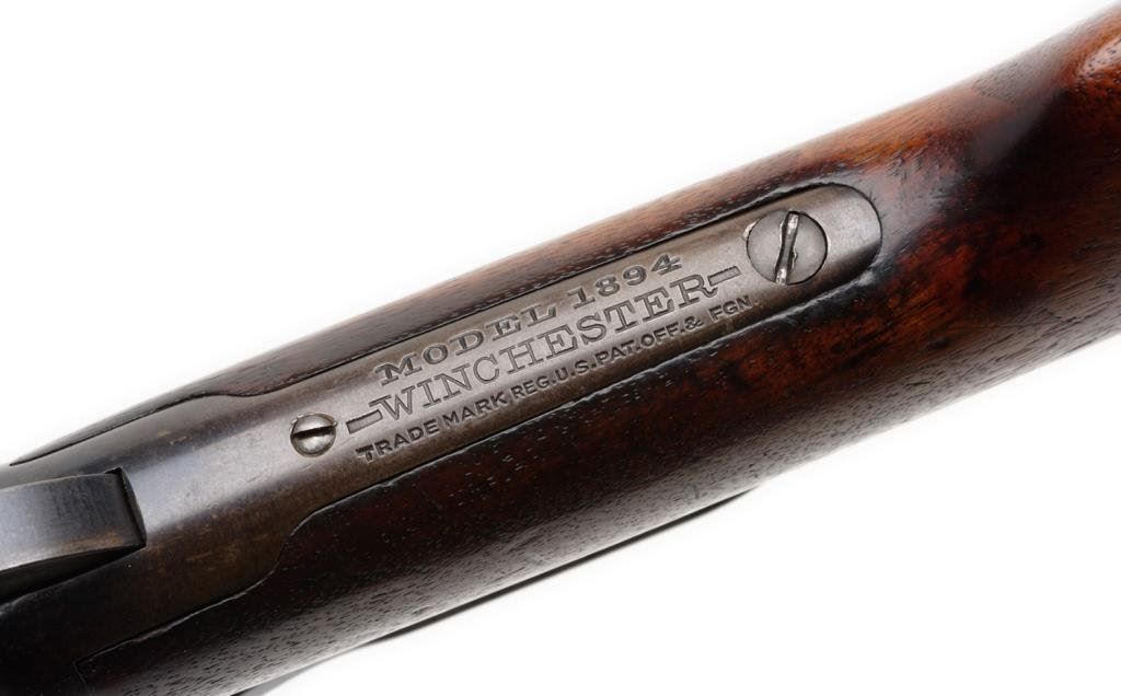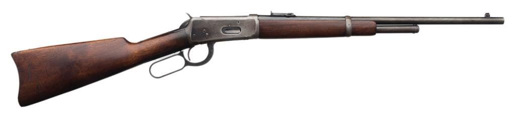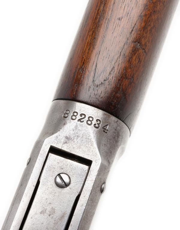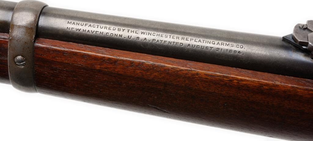 **Winchester Model 1894 Special Order saddle ring carbine, .32-40 caliber, ¾ magazine, S/N 882834; 30-50% original drifting blue with balance gone to grey with minor erosion and pinprick pitting just starting; sharp markings and good edges with very good stocks. Desirable caliber and feature. Est.: $1,000-$2,000.