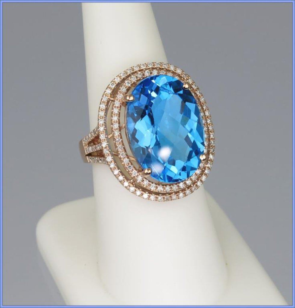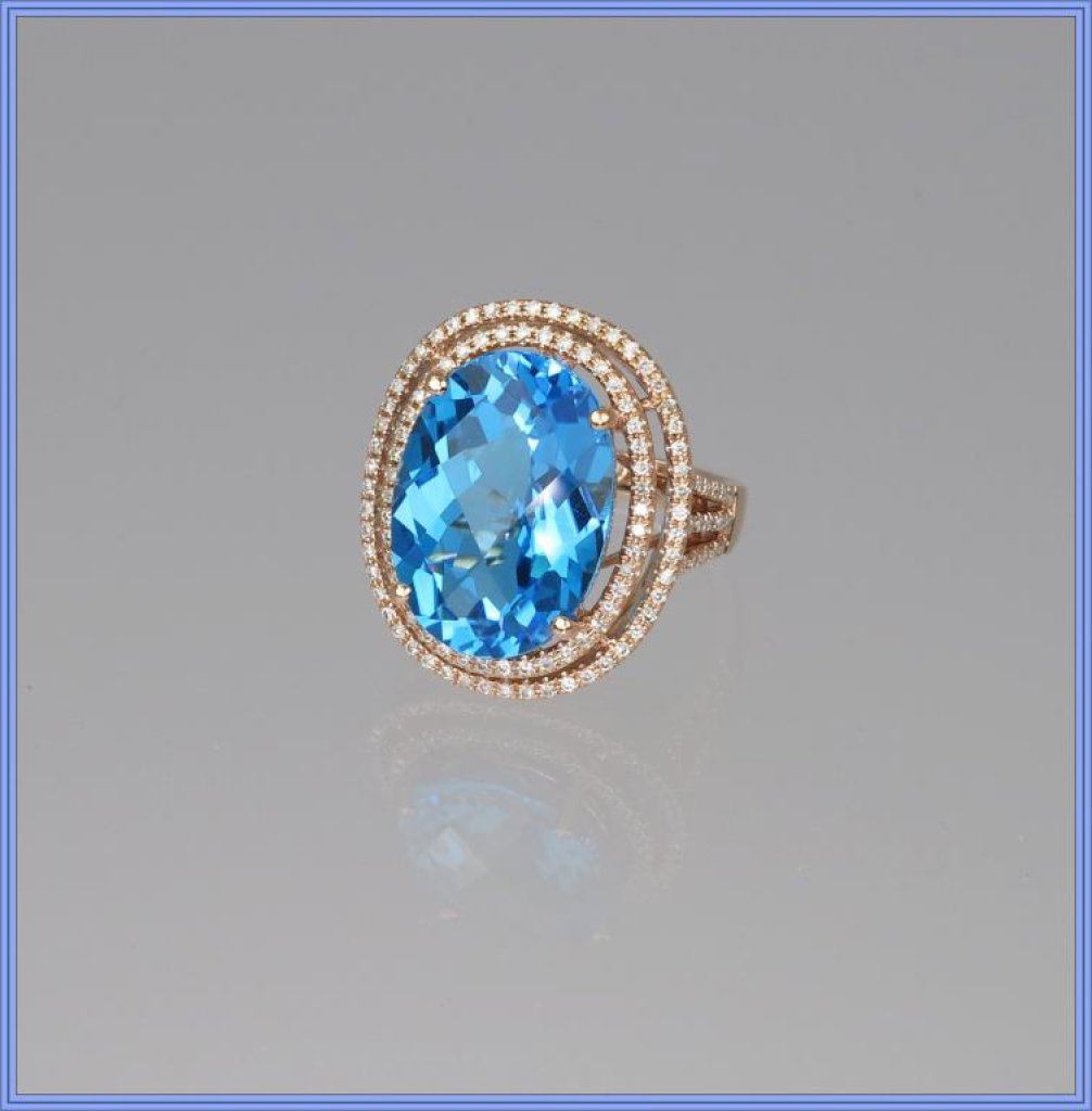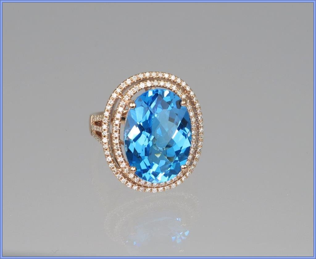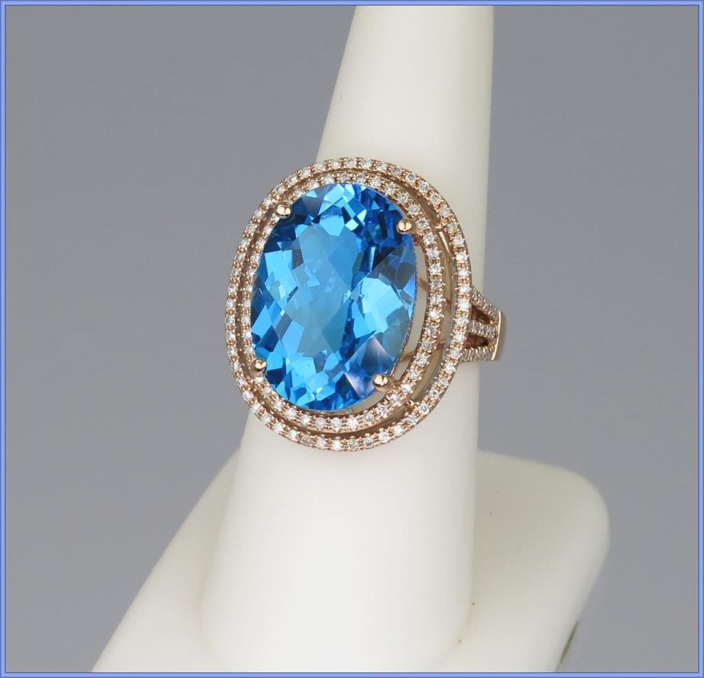 Magnificent Swiss Blue Topaz and Diamond Ring featuring an approx. 14.00 carat oval checkerboard cut topaz FINE color and VS clarity set in double halo setting of 138 round cut Diamonds weighing approx. 1.30 carats with G-H colors and SI clarity set in 9.90 grams of 14 karat Rose gold. NEW Piece. Retail $5,000-$6,000 Estimate $2,500-$3,000