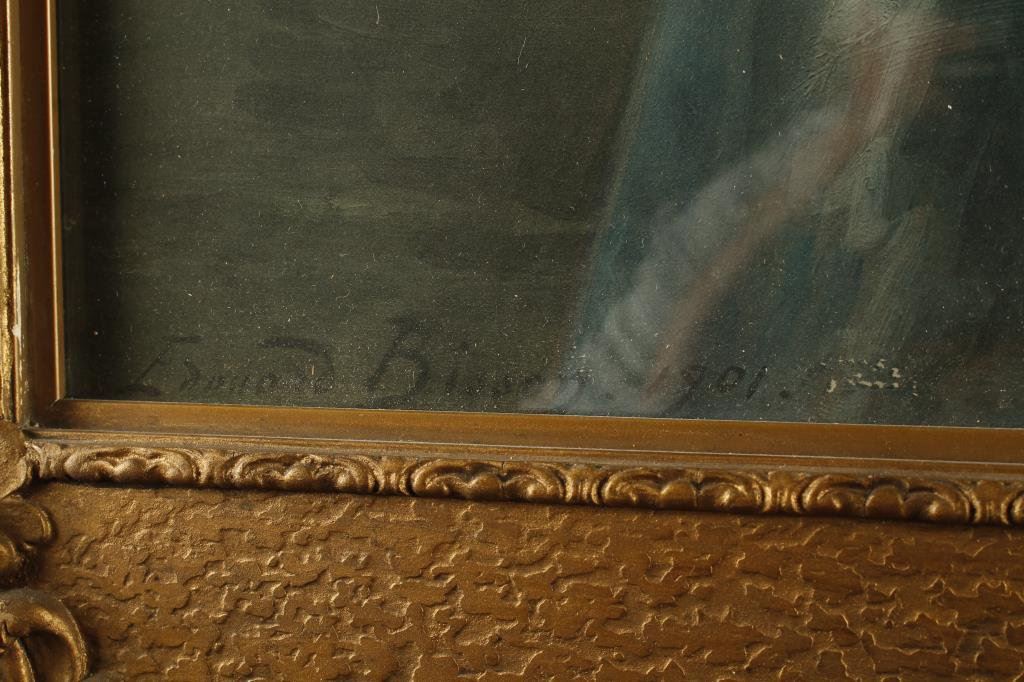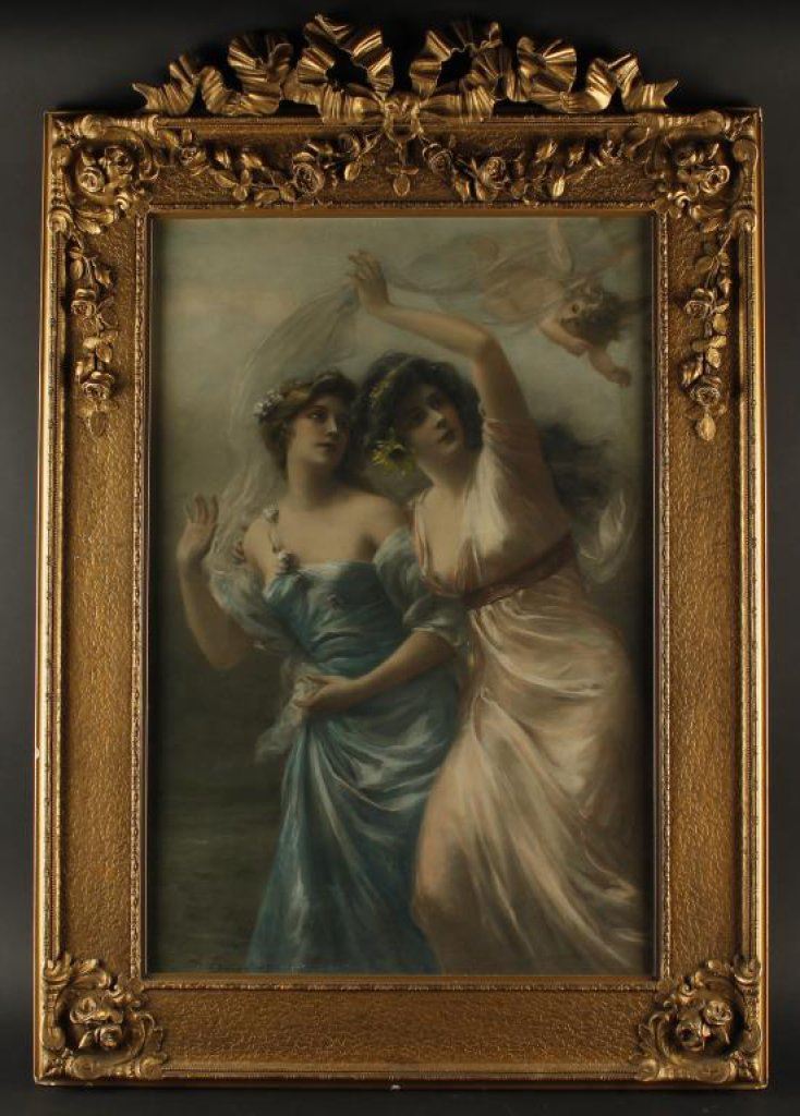 Watercolor on paper signed lower left Edouard Bisson or Bissen and dated 1901. Measures 28 1/2” x 19” in period ornate carved and gilded wood frame. The scene shows two lovely ladies one with exposed breast in an art nouveau style wispy gown. The condition is near fine showing just some slight aging and the frame also is near fine with just a few minor storage scratches, marks and etc. A quality artwork in every regard. $1,750-$3,500.