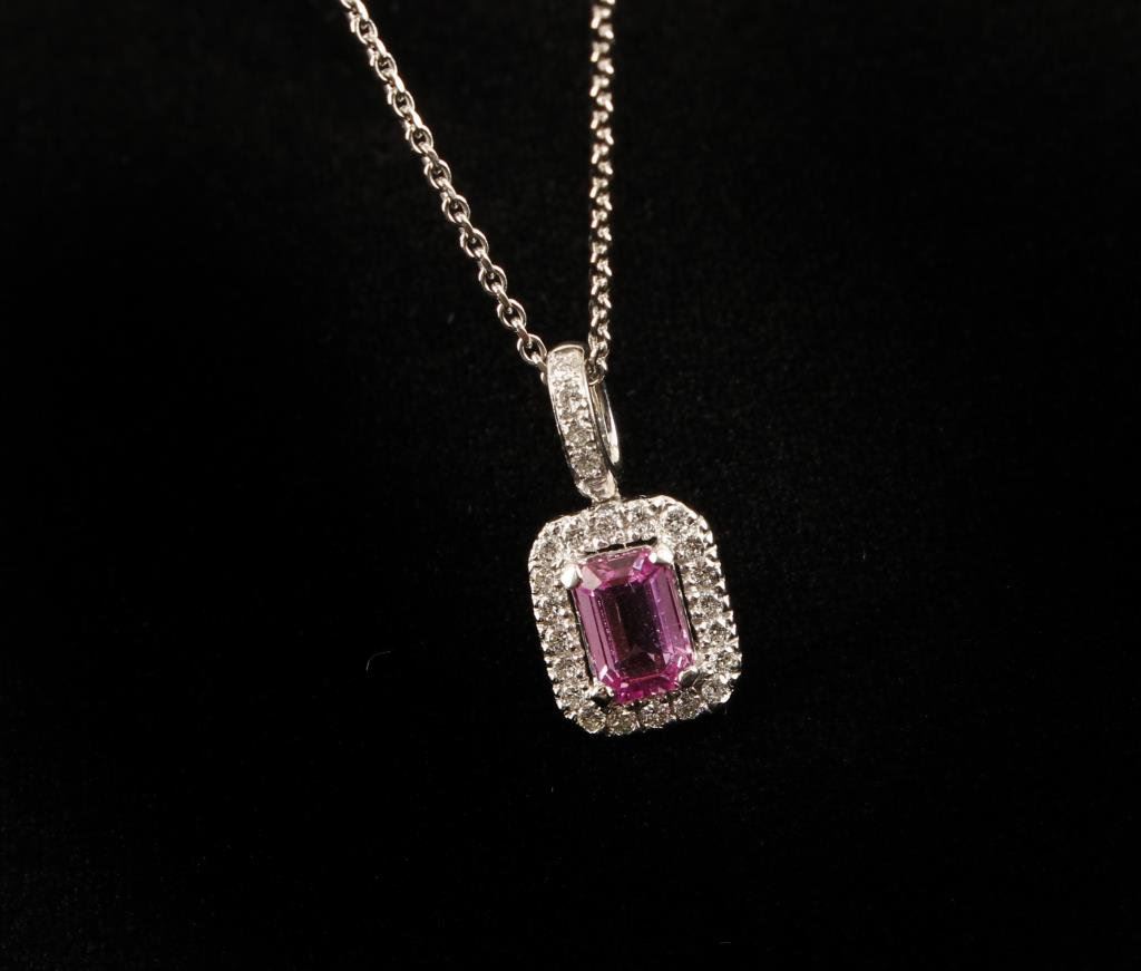 One 18k white gold pendant set with a 1.5ct fine pink sapphire and diamonds with a 18 k chain. Est:$2,000-3,000