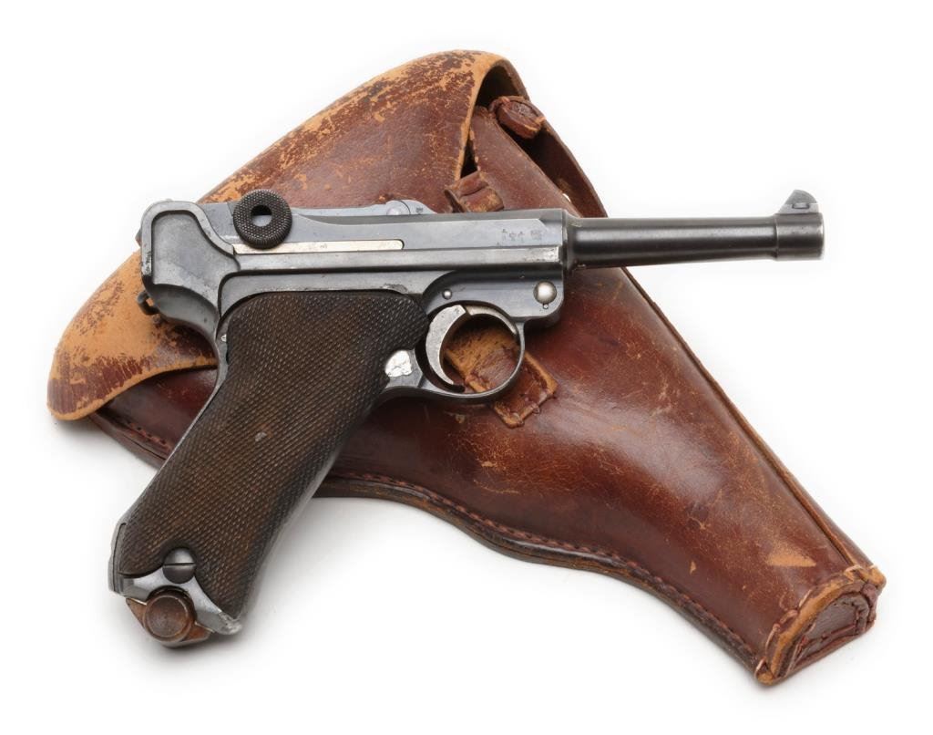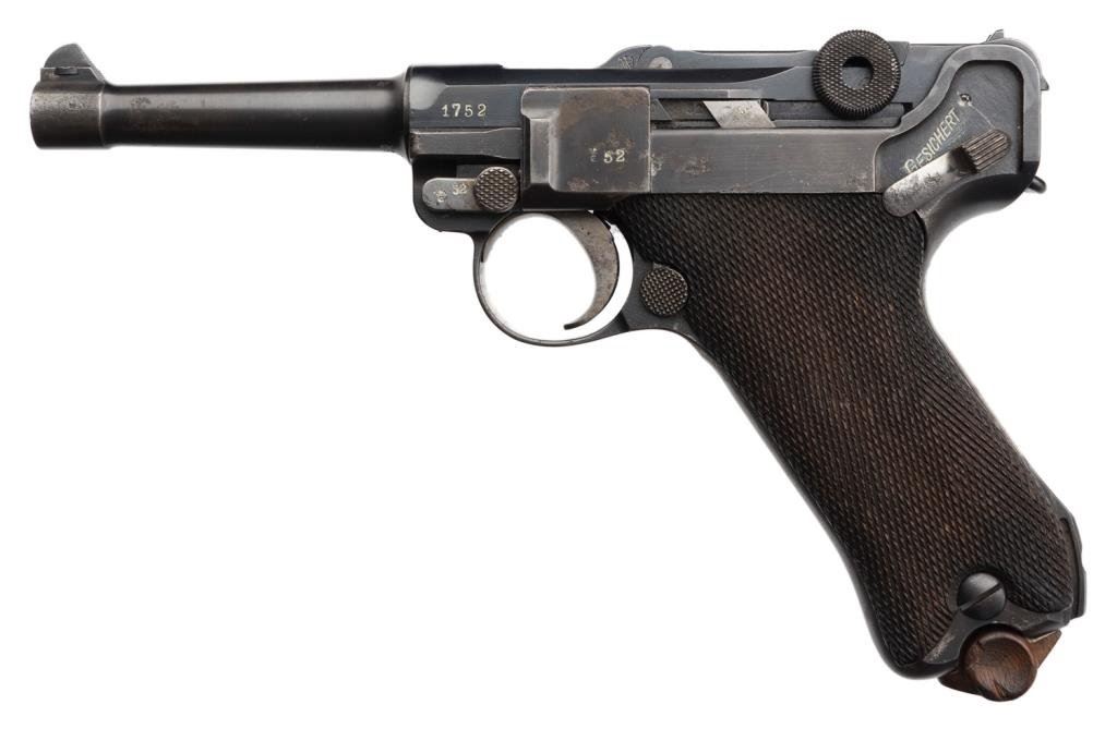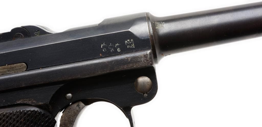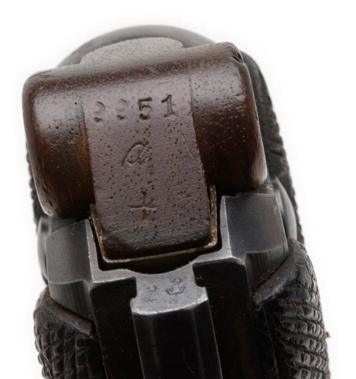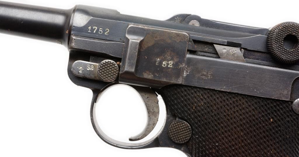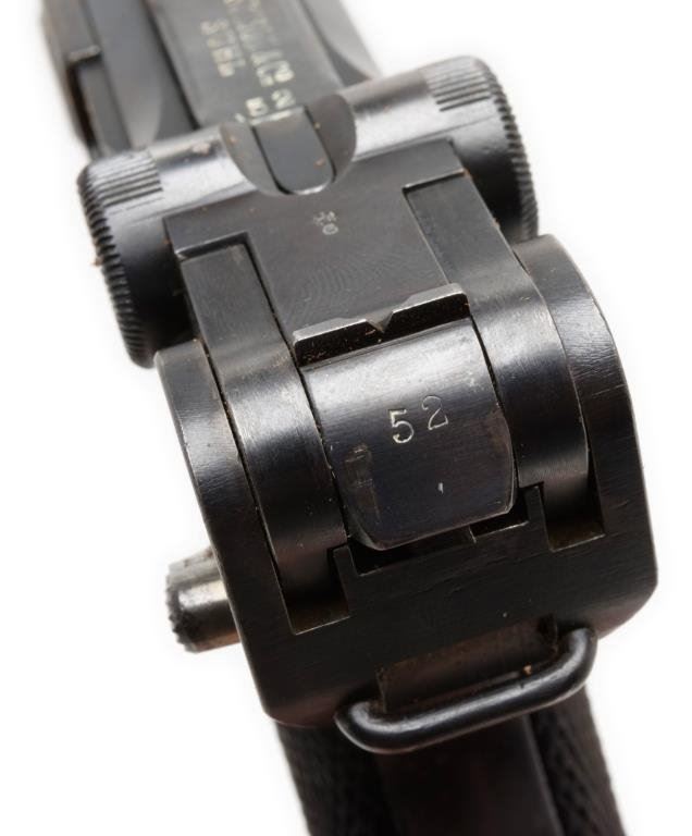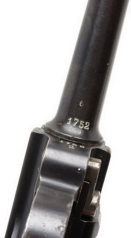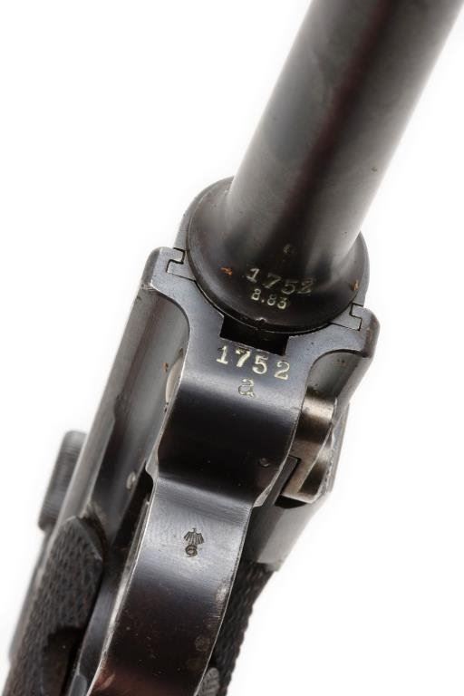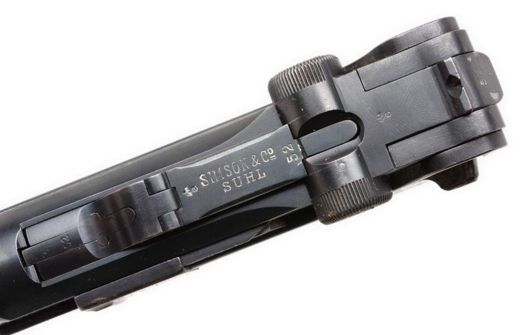 **Simpson re-work of a WW I German Luger for re-issue to Weimar Republic para-military and police forces; 9mm caliber, S/N 1752a, in good to very good condition with 70-80% original blue, some wear, minor pitting and normal aging; all matching except magazine. Est.: $1,500-$3,000.