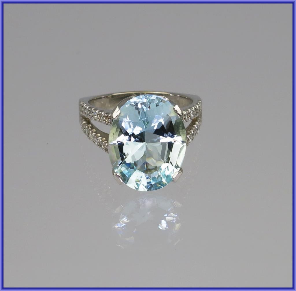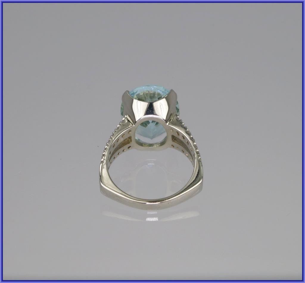 Spectacular Custom Made FINE Aquamarine and Diamond Ring featuring a 10.97 carat oval cut aquamarine with Fine color and VS clarity with 28 round brilliant cut Diamonds weighing 0.50 carats with H-J colors and VS/I clarity with comfortable European style contoured shank set in 11.00 grams of 14 karat white gold. NEW High Quality Collectors Piece. Please See Full Appraisal. Retail $6,000-$7,000 Estimate $3,000-$4,000
