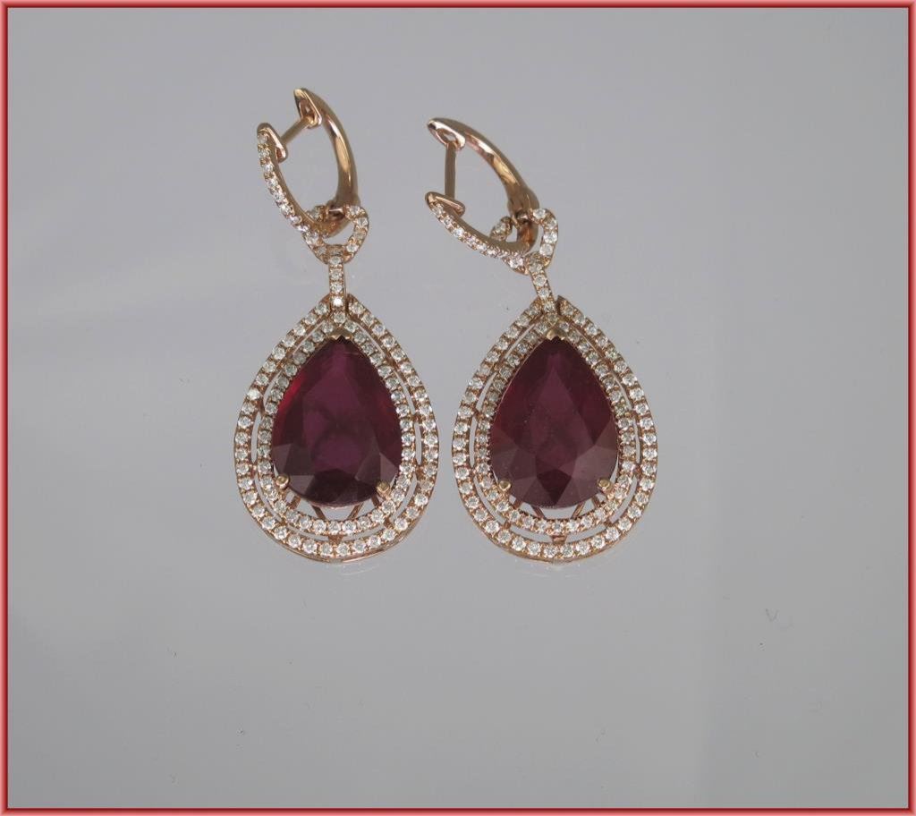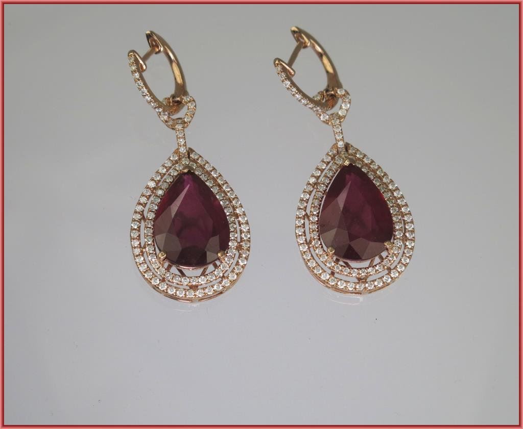 Pure Glamor Pear Shaped Ruby and Diamond Drop Earrings featuring 2 rubies weighing a combined weight of approx. 15.00 carats with amazing rich, intense red color and good clarity (most rubies heat/flux treated) accented by 216 round cut Diamonds weighing approx. 1.30 carats with H-I colors and SI/I clarity set in gorgeous double halo setting of 14 karat Rose Gold. NEW Earrings. Retail $5,000-$6,000 Estimate $3,000-$4,000