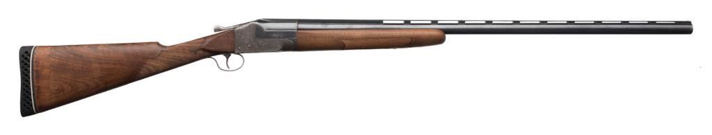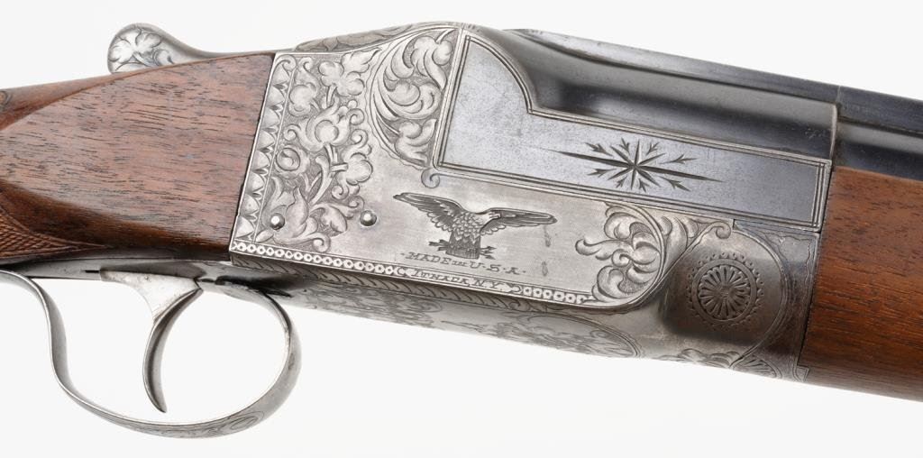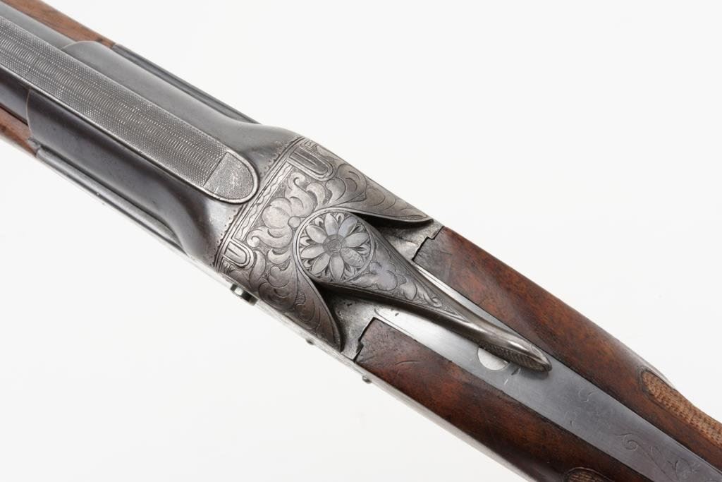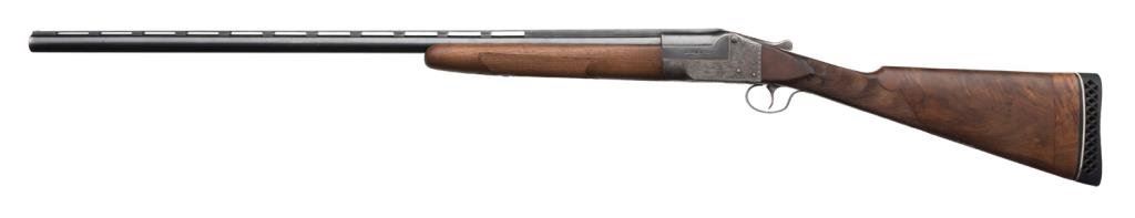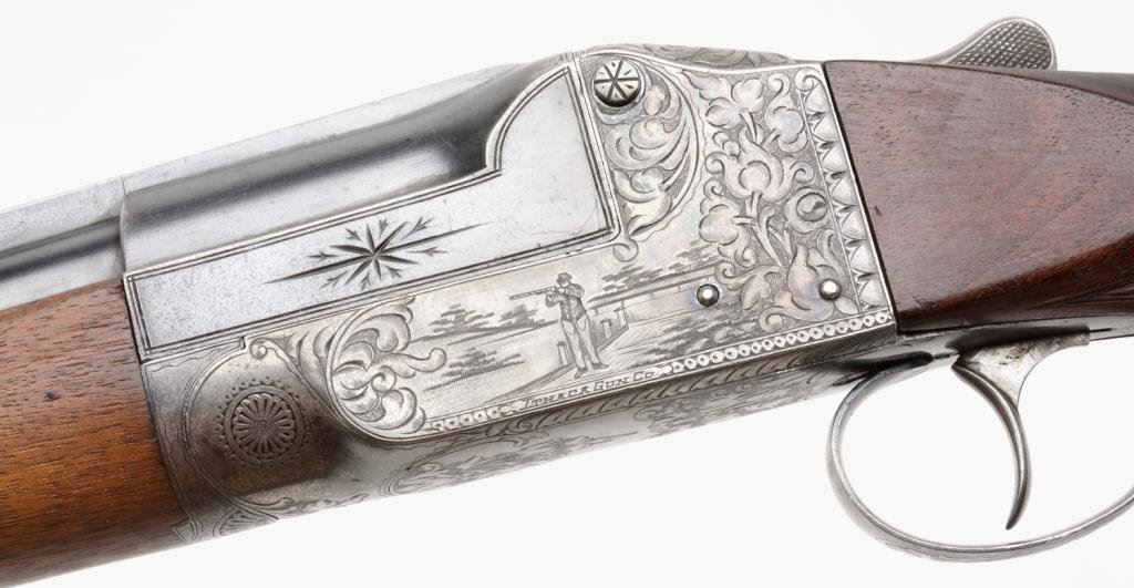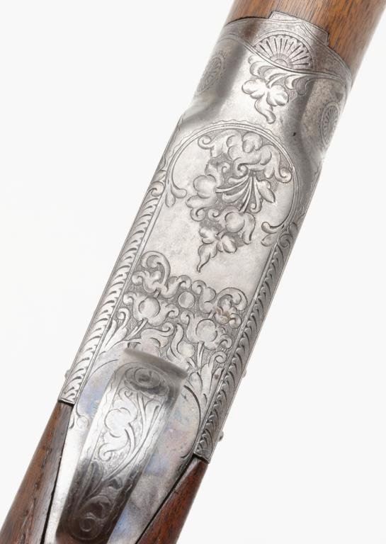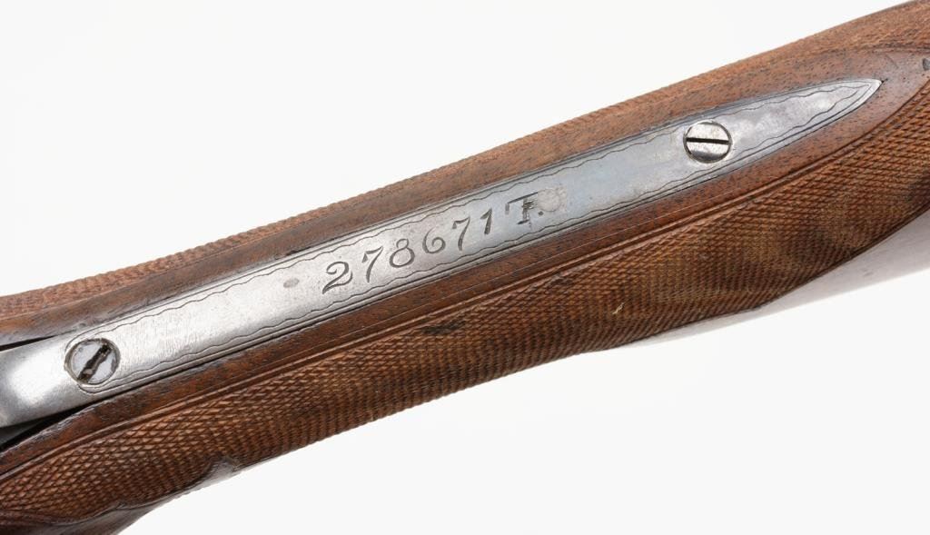 Ithaca Model 4E single shot shotgun, 12 gauge, 32” ventilated rib barrel, blue and case hardened finish, checkered wood stocks with extended butt stock, #278671. This gun is in overall very good condition showing the majority of its blue finish on the barrel assembly, scattered traces of original case color on the engraved receiver with balance gone to a silvery tone, very good bore that likely will clean to fine; crisp action, sharp engraving, very good wood stocks with deluxe checkering; finish has been removed; butt stock has been lengthened and Pachmayr hard rubber butt pad added; distance from front of trigger to end of butt wood is 13-3/4” and 14-3/4” to the end of the butt pad; a little extra finishing will complete this Ithaca. Est.: $1,300-$2,600.