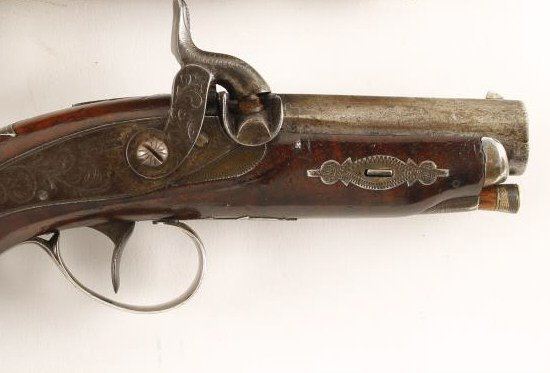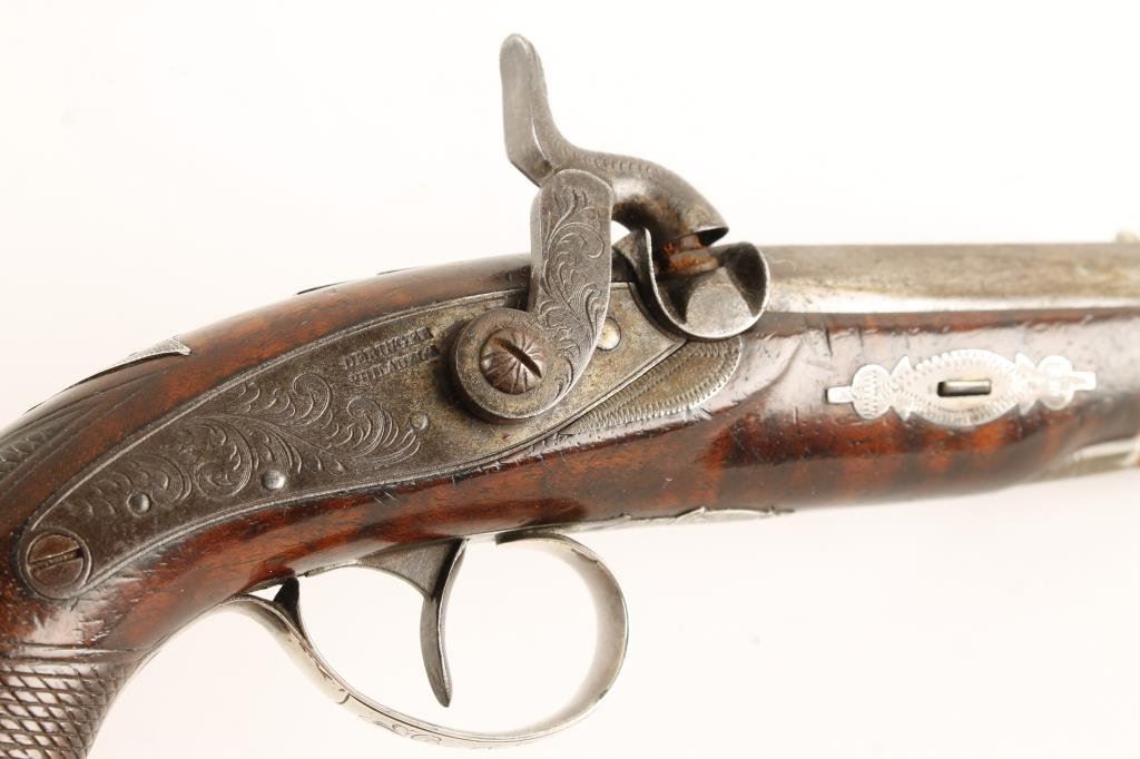 Deluxe Henry Deringer percussion pistol with double-wide gold bands, silver mountings and burl wood stock. Also cap box in butt and silver fore end cap. Well marked on lock and bbl with "P" proof and seven groove rifling. Approx. .44 caliber and 7" overall with 2 1/'2" bbl. Good to very good condition and an unusually high grade gun by Henry himself. Est:$3,500-7,000