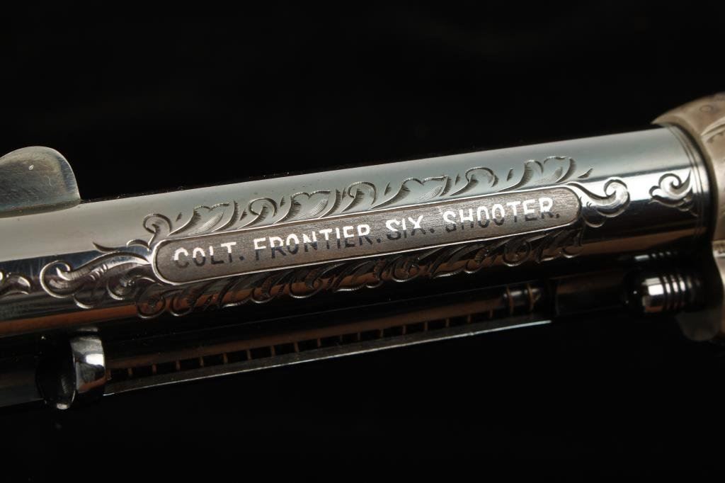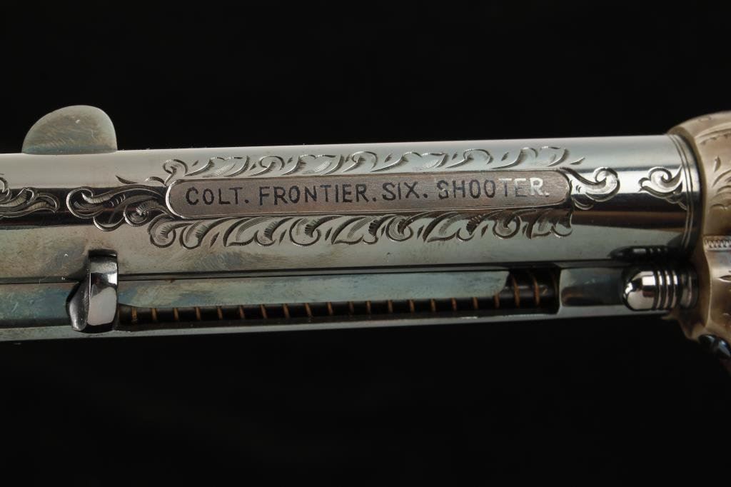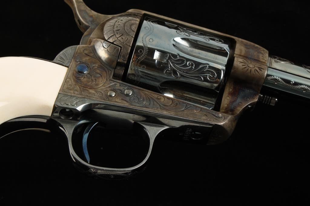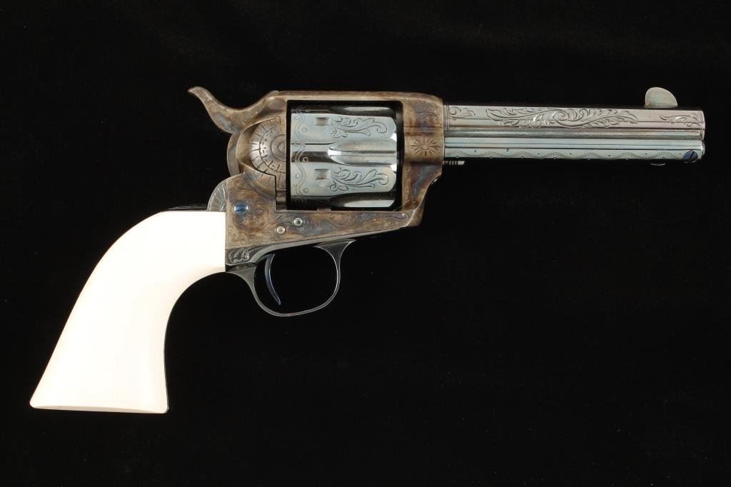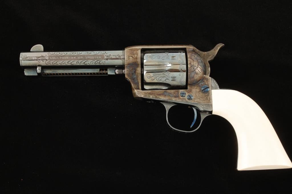 Western style engraved Colt SAA revolver, .44-40 cal., 4-3/4” barrel, blue and case hardened finish, etched panel, one-piece ivory grips, #86944 with “S” on frame, triggerguard and backstrap indicating shortening by factory. This revolver has been expertly restored including the etched panel and the grips are finely made replacements which fit impeccably; the markings and edges are sharp and crisp and approx. 99%+ of the re-blue and re-case coloring remains. The action is tight, the bore is excellent. This particular Single Action was previously in the collection of noted Hollywood personality and actor Hunter Von Leer who obtained it during his career from Carl Pitts who performed in shows with Tom Mix in Hollywood’s early days. Pitts got the gun from Walter Cameron who was an Indian agent who travelled to Hollywood in the early 1920’s where he opened the Ben Hur Stables in Culver City and supplied horses to the movie industry for 40 years. Walter Cameron was also a member of the L.A. Mounted Sheriff’s Posse. Several articles on