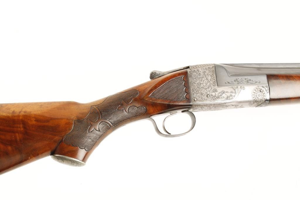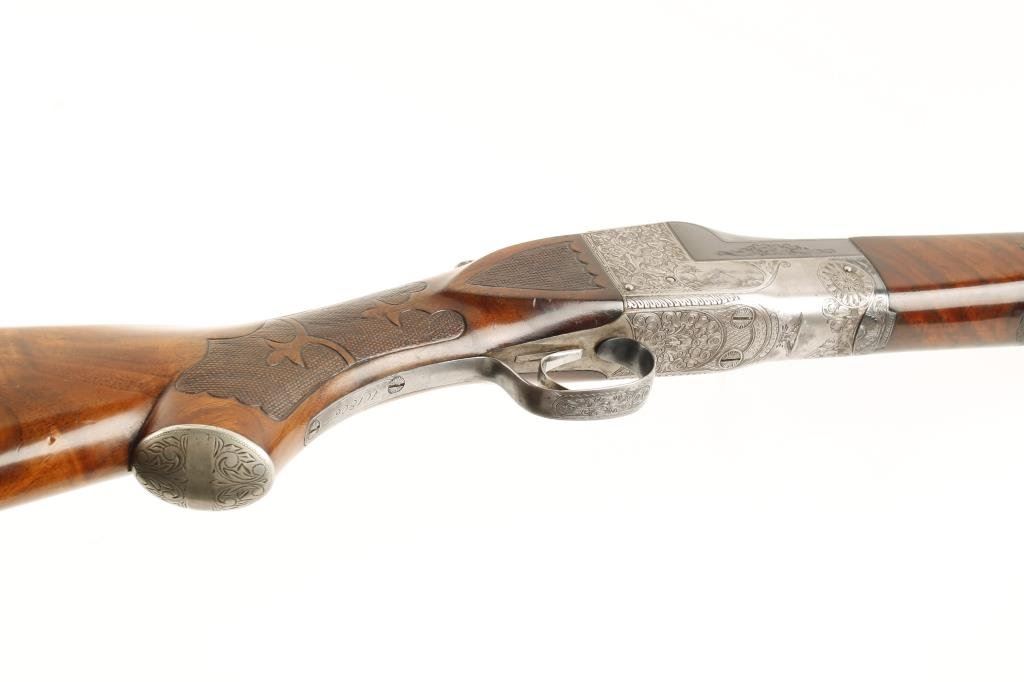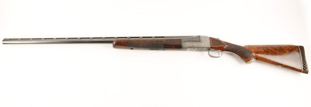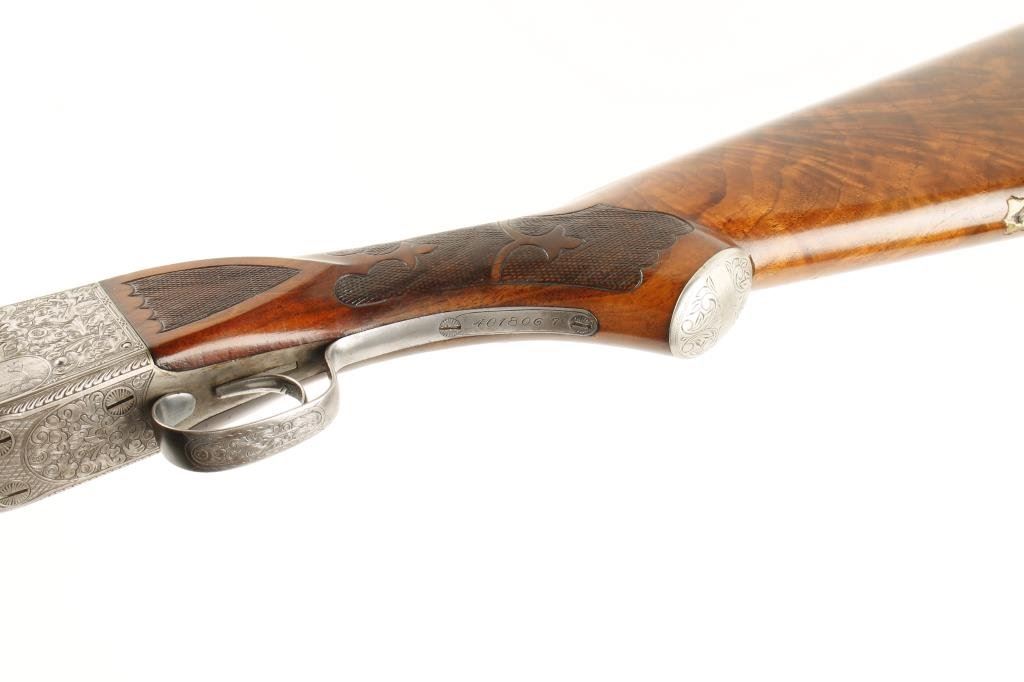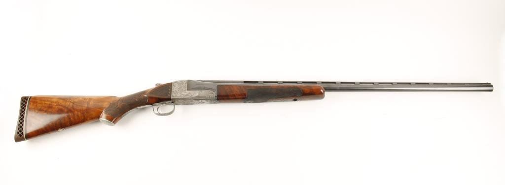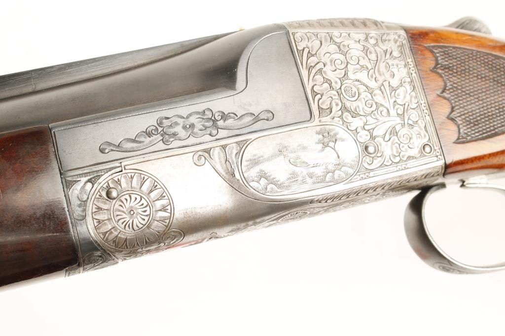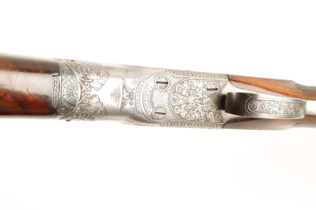 Ithaca #5 single shot Trap shotgun, 12 gauge, 32” ventilated rib barrel, blue finish, engraved receiver, single trigger, beautifully grained and deluxe checkered butt stock and checkered beavertail forend, #401806T in overall fine condition showing approx. 95% blue on barrels, crisp action, fine bore, length of pull to end of hard rubber butt pad is 14-1/4”; stocks are very good + to fine condition with only very slight scattered mars from storage; escutcheon on bottom of butt stock missing; a well-cared-for shotgun. (C&R/PPT). Est.: $2,000-$4,000.