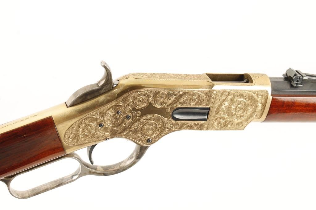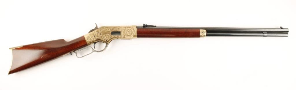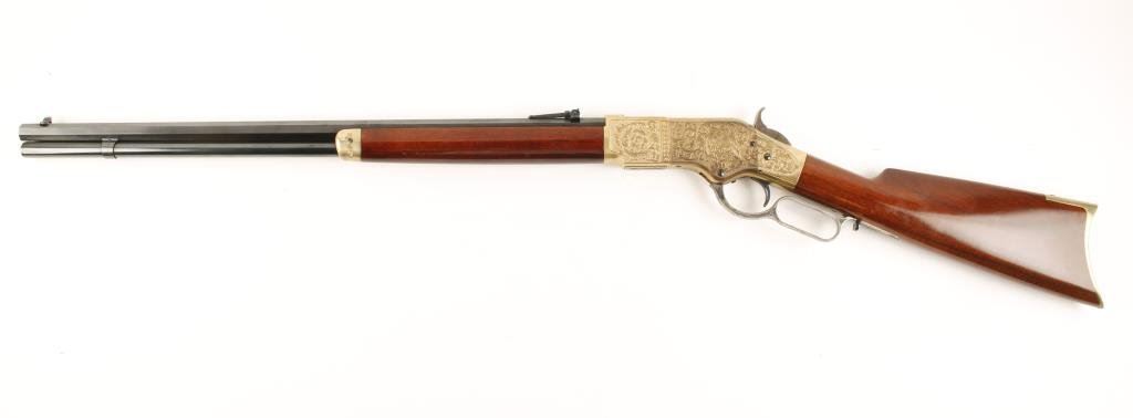 Italian Uberti copy of a Winchester Model 1866 lever action rifle, hand engraved in period style by Thomas of Oklahoma, .45LC cal., 24” octagon barrel, blue finish to barrel and loading tube, brass frame, walnut stock, #78634 in like new condition showing little use or handling; case colors to hammer and lever, crisp action, interior; fine bore, action and markings; beautiful engraving; fine wood stocks with a couple slight mars from storage. (Modern/PPT). Est.: $1,500-$3,000.
