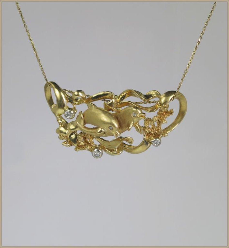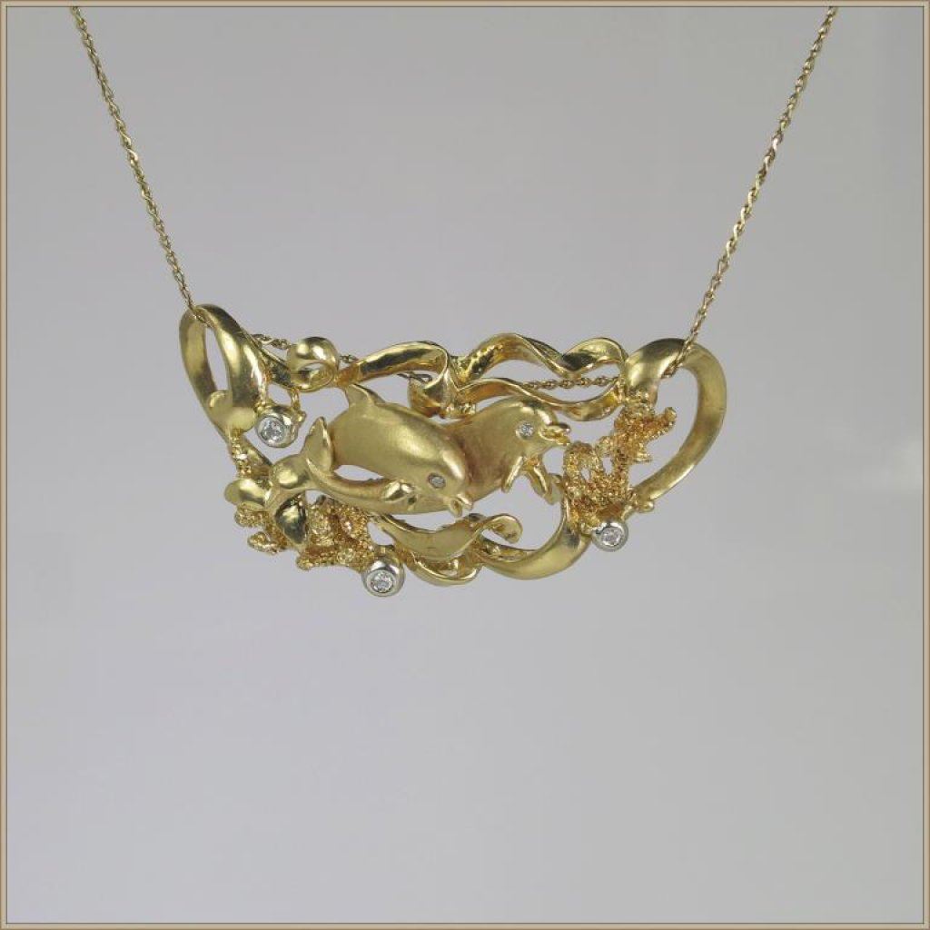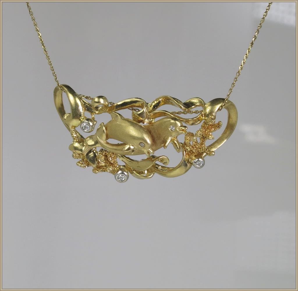 Wonderfully Unique Swimming Dolphins Necklace with 5 accent Diamonds this delightful estate piece is beautifully crafted with amazing detail, truly a unique work of art with hallmarked on back set in 14.10 grams of 14 karat yellow gold. Retail $2,000-$2,500 Estimate $1,200-$1,500