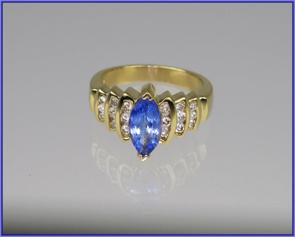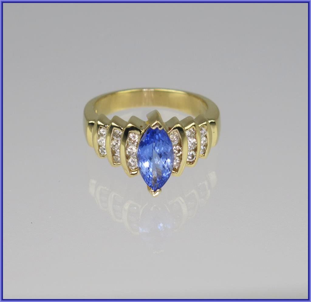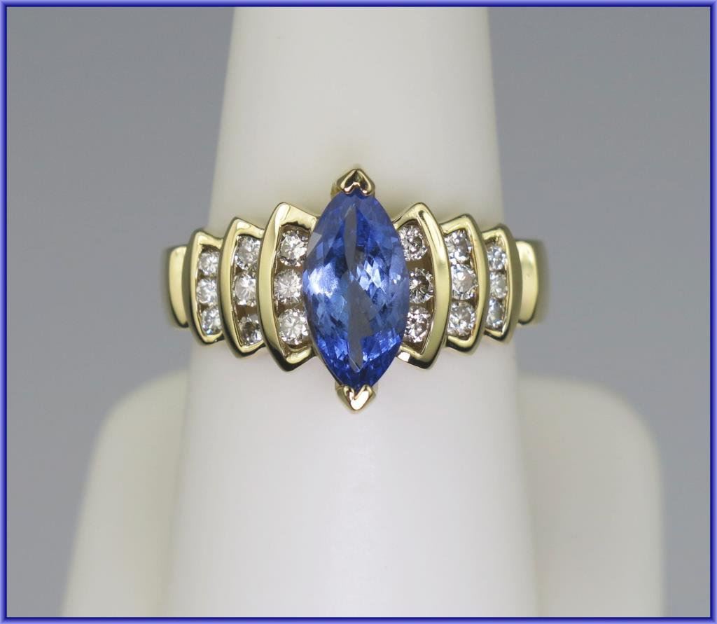 Alluring Tanzanite and Diamond Ring featuring an approx. 1.50 carat marquise cut tanzanite and 18 round cut channel set Diamonds weighing approx. 0.50 carats with H-I colors and VS/SI clarity set in 7.50 grams of yellow gold. Retail $2,000-$2,500 Estimate $1,200-$1,800