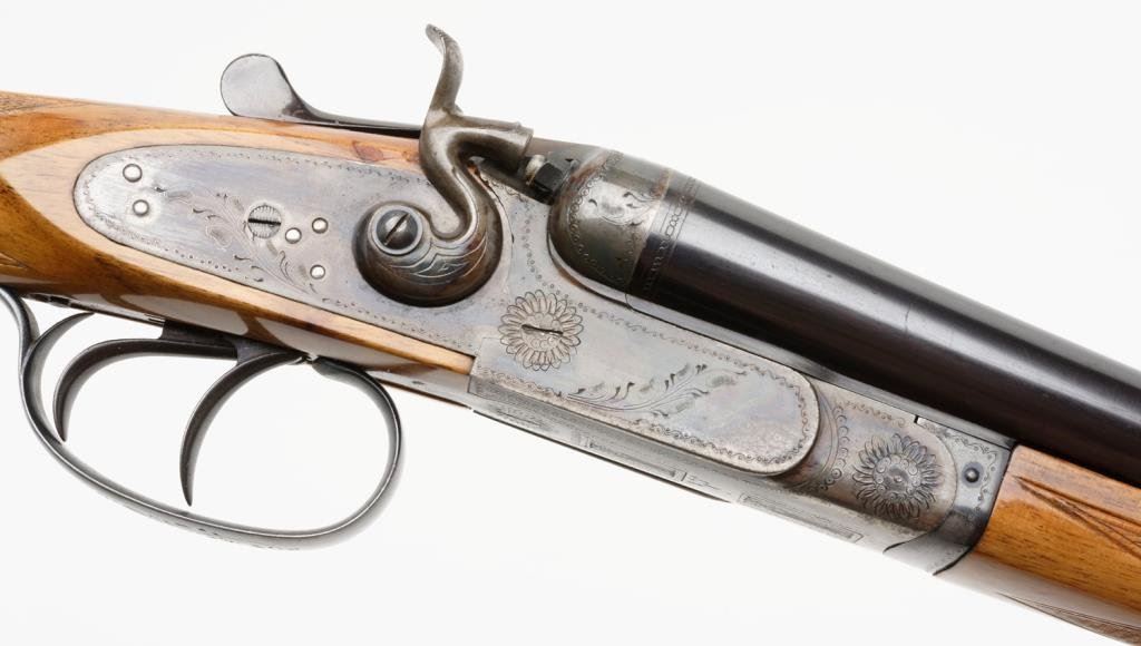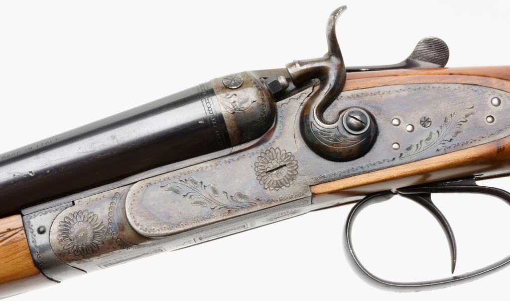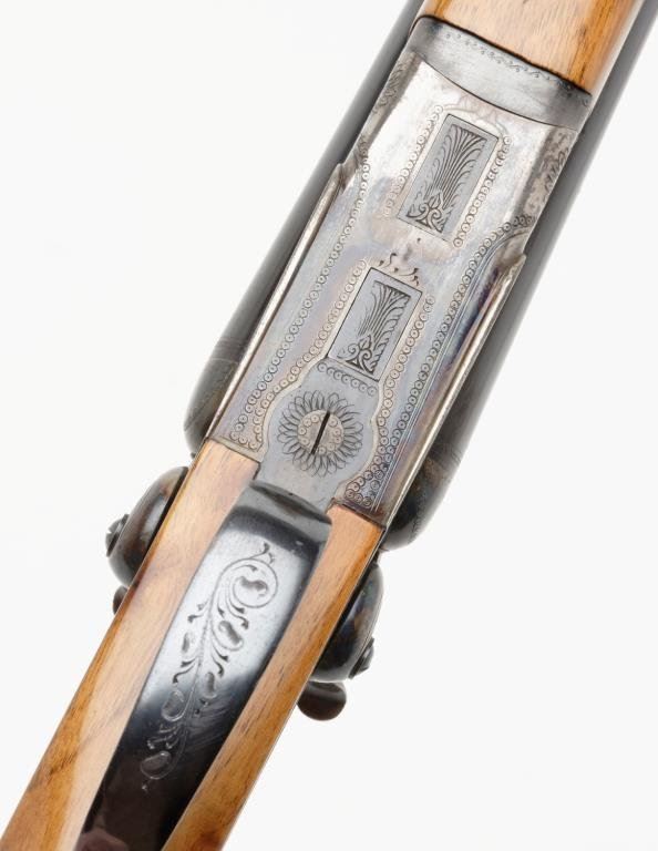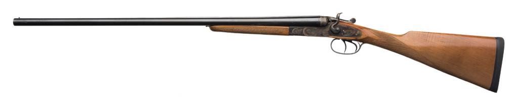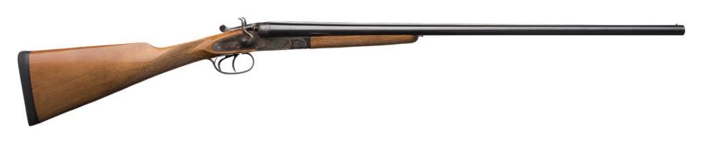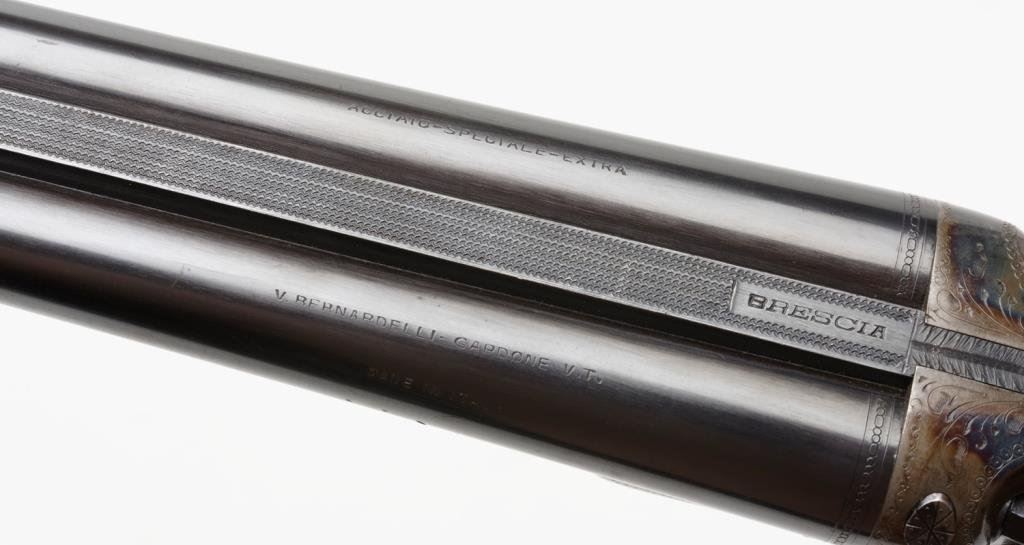 Italian-made Bernardelli SxS exposed hammers shotgun, 20 gauge, cylinder choked, 27-1/2” barrels, blue and case hardened finish, double triggers, checkered light wood stocks, length of pull 13-3/4”, #64912. This gun is in overall excellent condition showing approx. 95% original blue on the barrels with a spot of erosion on the left side of the left barrel at the muzzle; approx. 97% original case colors on the receiver, fine bores, crisp actions and markings, fine wood stocks with an old mar behind the right hammer, hard rubber butt pad; a beautiful quality Italian 20 gauge. Est.: $2,500-$3,500.