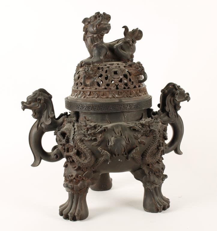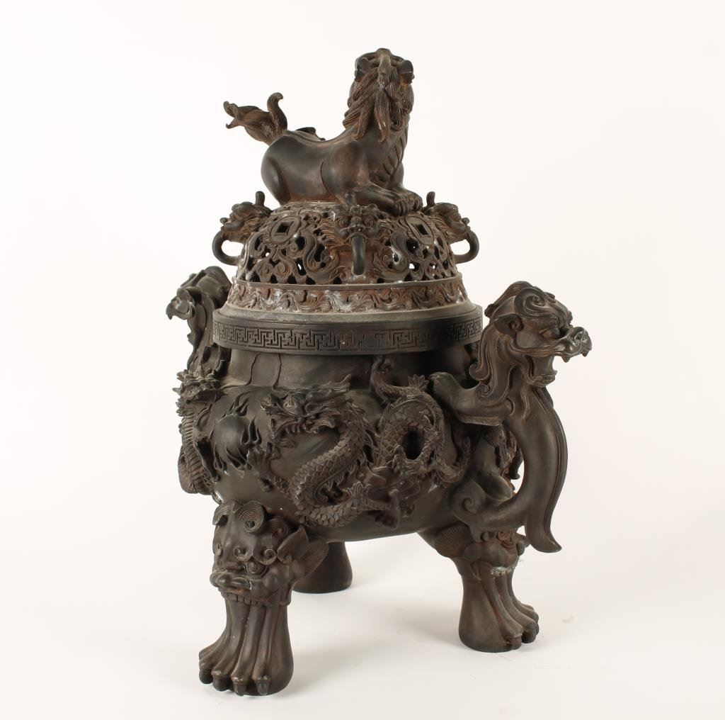 Lot 2259 20th Century cast bronze burner with great scenes of dragons and dark pati